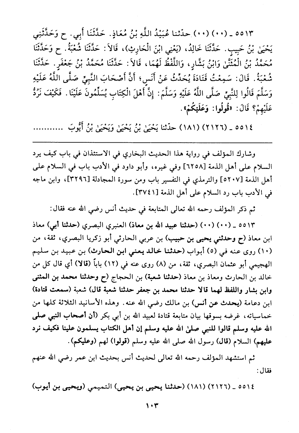 ٥٥١٣ - (٠٠) (٠٠) (حدثنا عبيد الله بن معاذ) العنبري البصري (حدثنا أبي) معاذ بن معاذ (ح وحدثني يحيى بن حبيب) بن عربي الحارثي أبو زكريا البصري، ثقة، من (١٠) روى عنه في (٥) أبواب (حدثنا خالد يعني ابن الحارث) بن عبيد بن سليم الهجيمي أبو عثمان البصري، ثقة، من (٨) روى عنه في (١٢) بابا (قالا) أي قال كل من خالد بن الحارث ومعاذ بن معاذ (حدثنا شعبة) بن الحجاج (ح وحدثنا محمد بن المثنى وابن بشار واللفظ لهما قالا حدثنا محمد بن جعفر حدثنا شعبة قال) شعبة (سمعت قتادة) ابن دعامة (يحدث عن أنس) بن مالك رضي الله عنه. وهذه الأسانيد الثلاثة كلها من خماسياته، غرضه بسوقها بيان متابعة قتادة لعبيد الله بن أبي بكر (أن أصحاب النبي صلى الله عليه وسلم قالوا للنبي صلى الله عليه وسلم إن أهل الكتاب يسلمون علينا فكيف نرد عليهم) السلام (قال) رسول الله صلى الله عليه وسلم (قولوا) لهم (وعليكم).