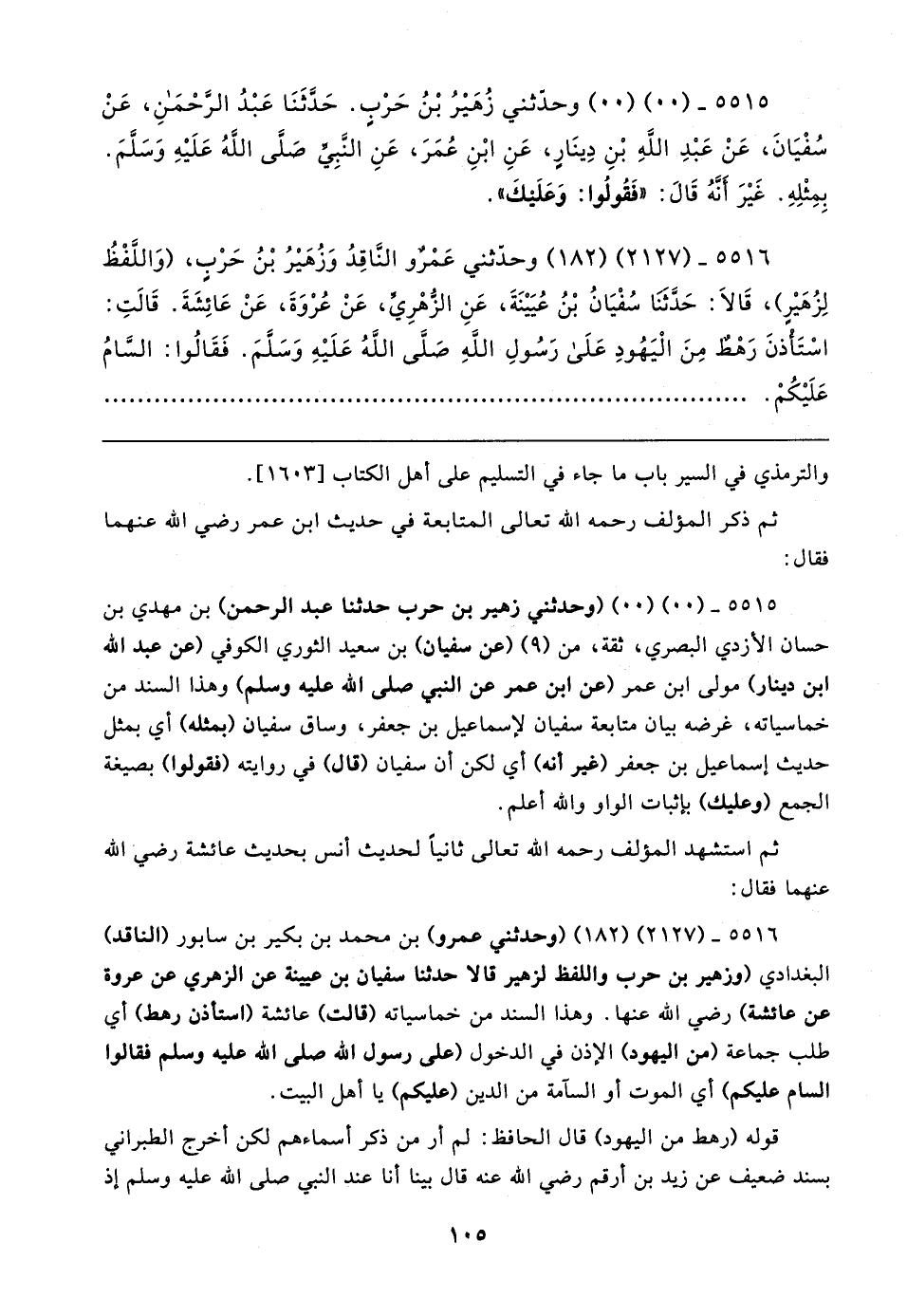 ٥٥١٥ - (٠٠) (٠٠) وَحَدَّثَنِي زُهَيرُ بْنُ حَرْبٍ. حَدَّثَنَا عَبْدُ الرَّحْمَنِ، عَنْ سُفْيَانَ، عَنْ عَبْدِ اللَّهِ بْنِ دِينَارٍ، عَنِ ابْنِ عُمَرَ، عَنِ النَّبِيِّ صلى الله عليه وسلم. بِمِثْلِهِ. غَيرَ أَنَّهُ قَال: "فَقُولُوا وَعَلَيكَ".