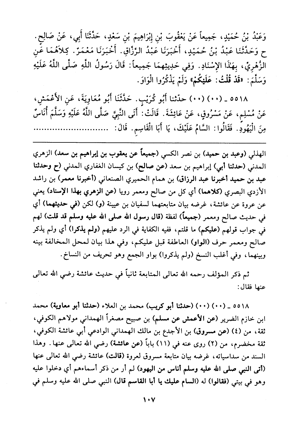 وَعَبْدُ بْنُ حُمَيدٍ، جَمِيعًا عَنْ يَعْقُوبَ بْنِ إِبْرَاهِيمَ بْنِ سَعْدٍ, حَدَّثَنَا أَبِي، عَنْ صَالِحٍ. ح وَحَدَّثَنَا عَبْدُ بْنُ حُمَيدٍ، أَخْبَرَنَا عَبْدُ الرَّزَّاقِ. أَخْبَرَنَا مَعْمَرٌ. كِلاهُمَا عَنِ الزُّهْرِيِّ، بِهَذَا الإِسْنَادِ. وَفِي حَدِيثِهِمَا جَمِيعًا: قَال رَسُولُ اللهِ صلى الله عليه وسلم: "قَدْ قُلْتُ: عَلَيكُمْ". وَلَمْ يَذْكُرُوا الْوَاوَ.