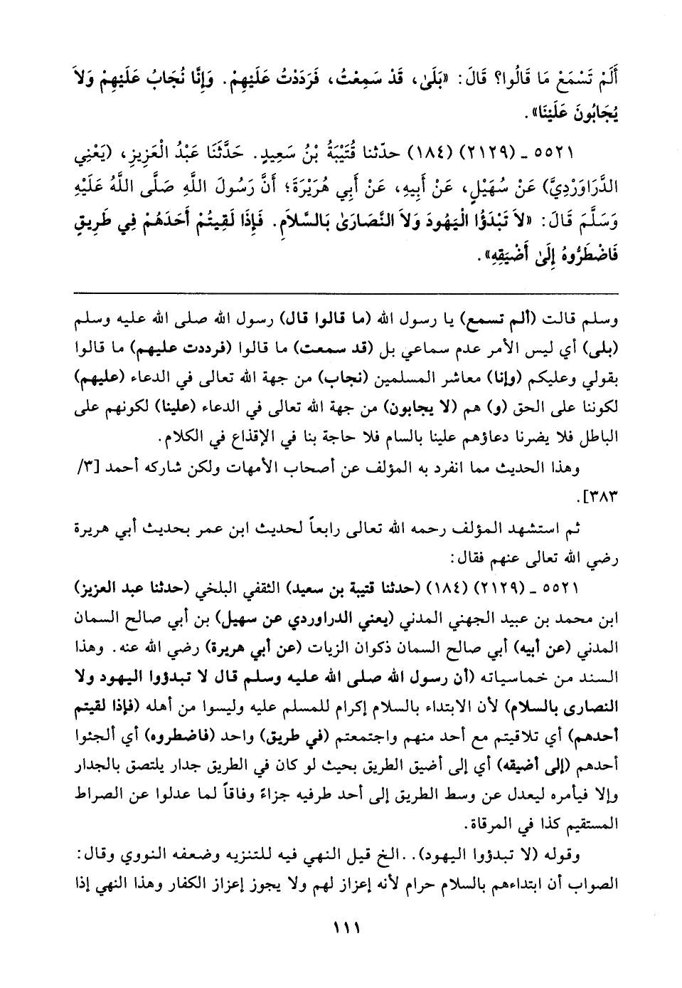 ٥٥٢١ - (٢١٢٩) (١٨٤) حَدَّثَنَا قُتَيبَةُ بْنُ سَعِيدٍ. حَدَّثَنَا عَبْدُ الْعَزِيزِ، (يَعْنِي الدَّرَاوَرْدِيَّ) عَنْ سُهَيلٍ، عَنْ أَبِيهِ، عَنْ أَبِي هُرَيرَةَ؛ أَنَّ رَسُولَ اللهِ صلى الله عليه وسلم قَال: "لَا تَبْدَءُوا الْيَهُودَ وَلَا النَّصَارَى بِالسَّلامِ. فَإِذَا لَقِيتُمْ أَحَدَهُمْ فِي طَرِيقٍ فَاضْطَرُّوهُ إِلَى أَضْيَقِهِ"