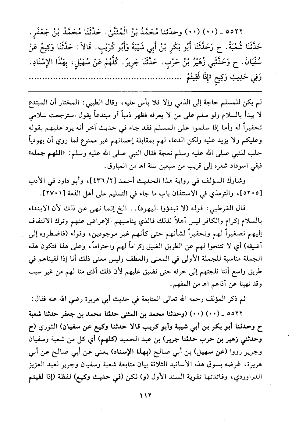 ٥٥٢٢ - (٠٠) (٠٠) (وحدثنا محمد بن المثنى حدثنا محمد بن جعفر حدثنا شعبة ح وحدثنا أبو بكر بن أبي شيبة وأبو كريب قالا حدثنا وكيع عن سفيان) الثوري (ح وحدثني زهير بن حرب حدثنا جرير) بن عبد الحميد (كلهم) أي كل من شعبة وسفيان وجرير رووا (عن سهيل) بن أبي صالح (بهذا الإسناد) يعني عن أبي صالح عن أبي هريرة، غرضه بسوق هذه الأسانيد الثلاثة بيان متابعة شعبة وسفيان وجرير لعبد العزيز الدراوردي، وفائدتها تقوية السند الأول (و) لكن (في حديث وكيع) لفظة (إذا لقيتم