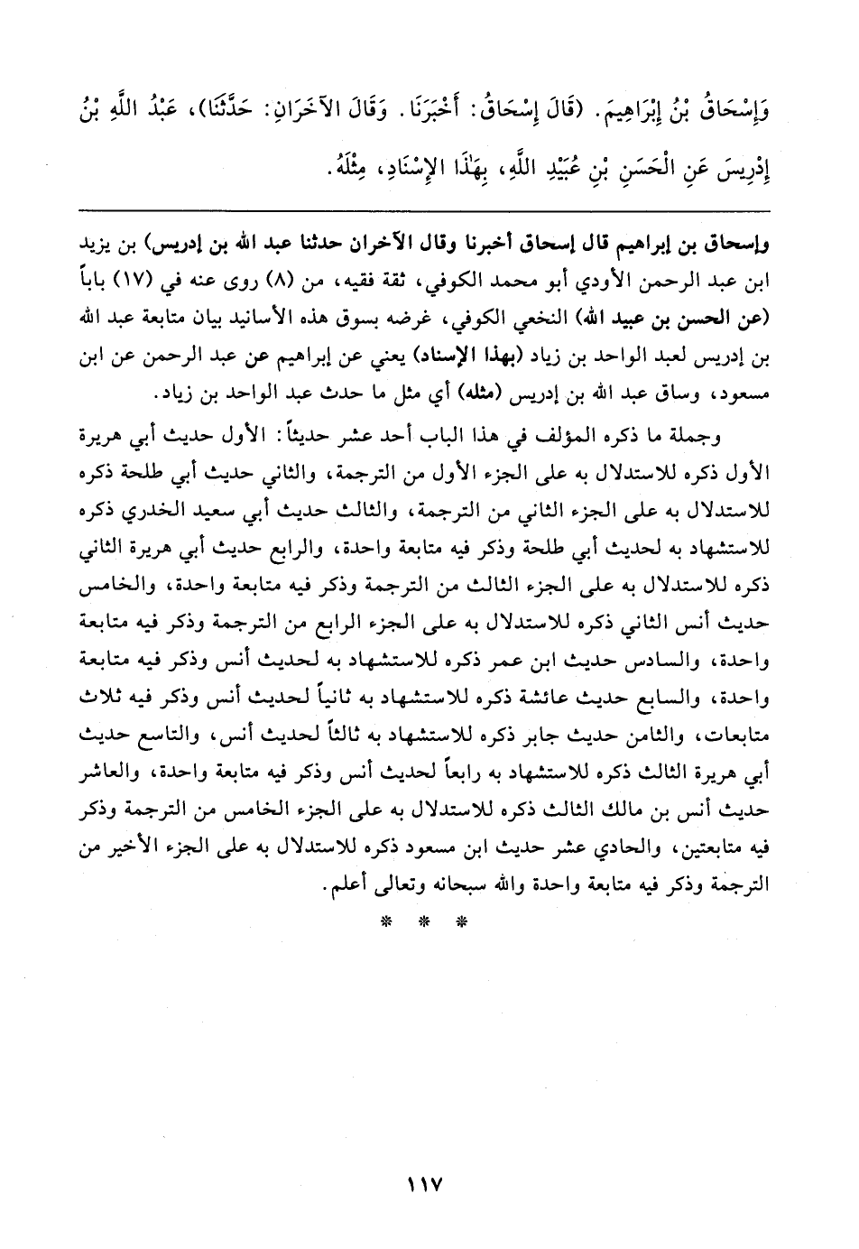 وإسحاق بن إبراهيم قال إسحاق أخبرنا وقال الآخران حدثنا عبد الله بن إدريس) بن يزيد بن عبد الرحمن الأودي أبو محمد الكوفي، ثقة فقيه، من (٨) روى عنه في (١٧) بابا (عن الحسن بن عبيد الله) النخعي الكوفي، غرضه بسوق هذه الأسانيد بيان متابعة عبد الله بن إدريس لعبد الواحد بن زياد (بهذا الإسناد) يعني عن إبراهيم عن عبد الرحمن عن ابن مسعود، وساق عبد الله بن إدريس (مثله) أي مثل ما حدث عبد الواحد بن زياد.
