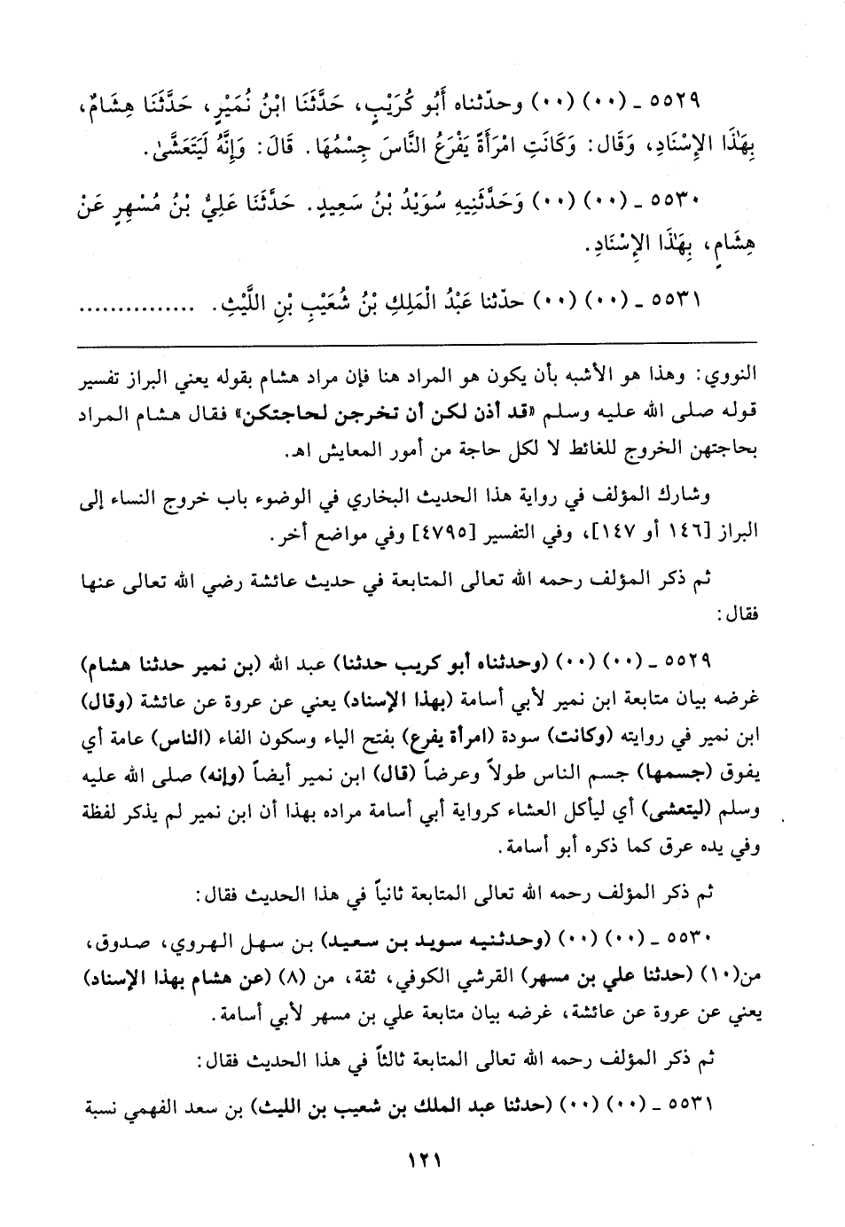 النووي: وهذا هو الأشبه بأن يكون هو المراد هنا فإن مراد هشام بقوله يعني البراز تفسير قوله صلى الله عليه وسلم " قد أذن لكن أن تخرجن لحاجتكن " فقال هشام المراد بحاجتهن الخروج للغائط لا لكل حاجة من أمور المعايش اهـ.