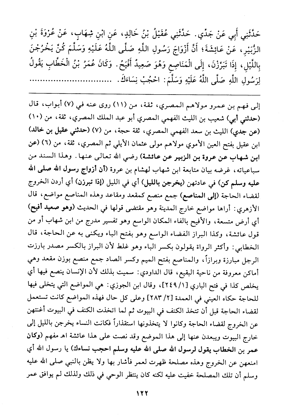 حَدَّثَنِي أَبِي عَنْ جَدِّي. حَدَّثَنِي عُقَيلُ بْنُ خَالِدٍ, عَنِ ابْنِ شِهَابٍ، عَنْ عُرْوَةَ بْنِ الزُّبَيرِ، عَنْ عَائِشَةَ؛ أَنَّ أَزْوَاجَ رَسُولِ اللَّهِ صلى الله عليه وسلم كُنَّ يَخْرُجْنَ بِاللَّيلِ, إِذَا تَبَرَّزْنَ, إِلَى الْمَنَاصِعِ وَهُوَ صَعِيدٌ أَفْيَحُ. وَكَانَ عُمَرُ بْنُ الْخَطَّابِ يَقُولُ لِرَسُولِ اللَّهِ صلى الله عليه وسلم: احْجُبْ نِسَاءَكَ