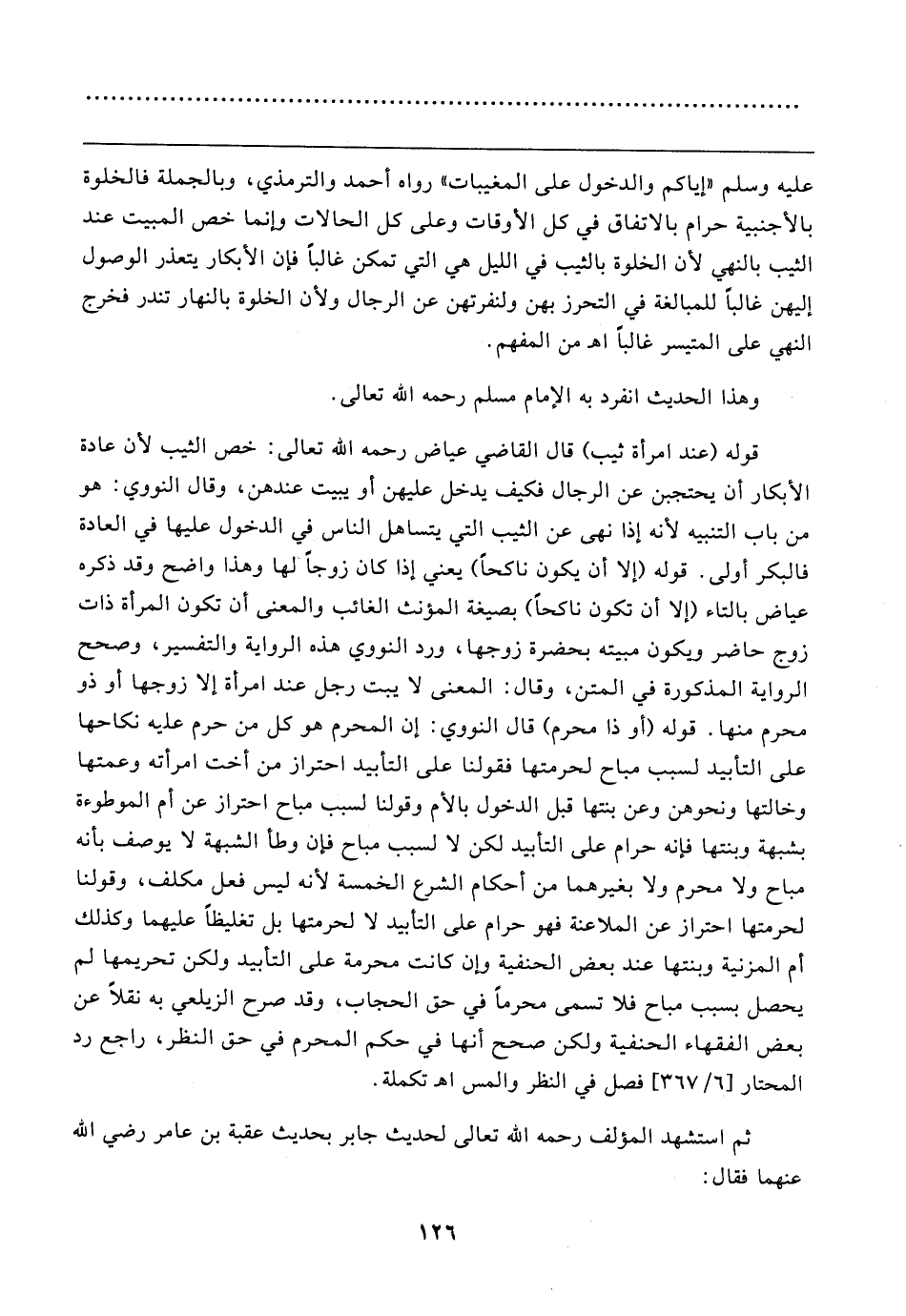 قوله (عند امرأة ثيب) قال القاضي عياض رحمه الله تعالى: خص الثيب لأن عادة الأبكار أن يحتجبن عن الرجال فكيف يدخل عليهن أو يبيت عندهن، وقال النووي: هو من باب التنبيه لأنه إذا نهى عن الثيب التي يتساهل الناس في الدخول عليها في العادة فالبكر أولى. قوله (إلا أن يكون ناكحًا) يعني إذا كان زوجًا لها وهذا واضح وقد ذكره عياض بالتاء (إلا أن تكون ناكحًا) بصيغة المؤنث الغائب والمعنى أن تكون المرأة ذات زوج حاضر ويكون مبيته بحضرة زوجها، ورد النووي هذه الرواية والتفسير، وصحح الرواية المذكورة في المتن، وقال: المعنى لا يبت رجل عند امرأة إلا زوجها أو ذو محرم منها. قوله (أو ذا محرم) قال النووي: إن المحرم هو كل من حرم عليه نكاحها على التأبيد لسبب مباح لحرمتها فقولنا على التأبيد احتراز من أخت امرأته وعمتها وخالتها ونحوهن وعن بنتها قبل الدخول بالأم وقولنا لسبب مباح احتراز عن أم الموطوءة بشبهة وبنتها فإنه حرام على التأبيد لكن لا لسبب مباح فإن وطأ الشبهة لا يوصف بأنه مباح ولا محرم ولا بغيرهما من أحكام الشرع الخمسة لأنه ليس فعل مكلف، وقولنا لحرمتها احتراز عن الملاعنة فهو حرام على التأبيد لا لحرمتها بل تغليظًا عليهما وكذلك أم المزنية وبنتها عند بعض الحنفية وإن كانت محرمة على التأبيد ولكن تحريمها لم يحصل بسبب مباح فلا تسمى محرمًا في حق الحجاب، وقد صرح الزيلعي به نقلًا عن بعض الفقهاء الحنفية ولكن صحح أنها في حكم المحرم في حق النظر، راجع رد المحتار [٦/ ٣٦٧] فصل في النظر والمس اهـ تكملة.