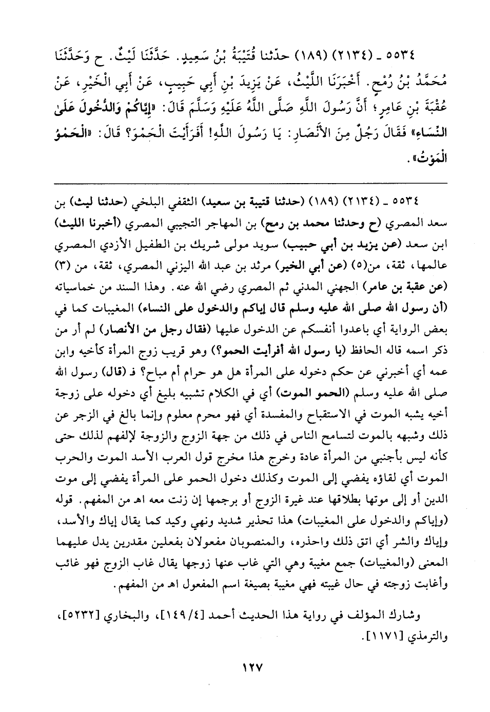 ٥٥٣٤ - (٢١٣٤) (١٨٩) حَدَّثَنَا قُتَيبَةُ بْنُ سَعِيدٍ. حَدَّثَنَا لَيثٌ. ح وَحَدَّثَنَا مُحَمَّدُ بْنُ رُمْحٍ. أَخْبَرَنَا اللَّيثُ، عَنْ يَزِيدَ بْنِ أَبِي حَبِيبٍ، عَنْ أَبِي الْخَيرِ، عَنْ عُقْبَةَ بْنِ عَامِرٍ؛ أَنَّ رَسُولَ اللهِ صلى الله عليه وسلم قَال: "إِيَّاكُمْ وَالدُّخُولَ عَلَى النِّسَاءِ" فَقَال رَجُلٌ مِنَ الأَنْصَارِ: يَا رَسُولَ اللهِ! أَفَرَأَيتَ الْحَمْوَ؟ قَال: "الْحَمْوُ الْمَوْتُ"