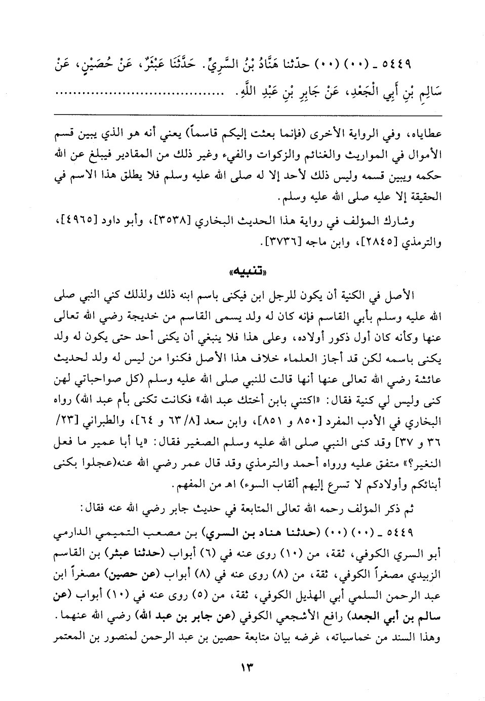 ٥٤٤٩ - (٠٠) (٠٠) (حدثنا هناد بن السري) بن مصعب التميمي الدارمي أبوالسري الكوفي، ثقة، من (١٠) روى عنه في (٦) أبواب (حدثنا عبثر) بن القاسم الزبيدي مصغرًا الكوفي، ثقة، من (٨) روى عنه في (٨) أبواب (عن حصين) مصغرًا ابن عبد الرحمن السلمي أبي الهذيل الكوفي، ثقة، من (٥) روى عنه في (١٠) أبواب (عن سالم بن أبي الجعد) رافع الأشجعي الكوفي (عن جابر بن عبد الله) رضي الله عنهما. وهذا السند من خماسياته، غرضه بيان متابعة حصين بن عبد الرحمن لمنصور بن المعتمر