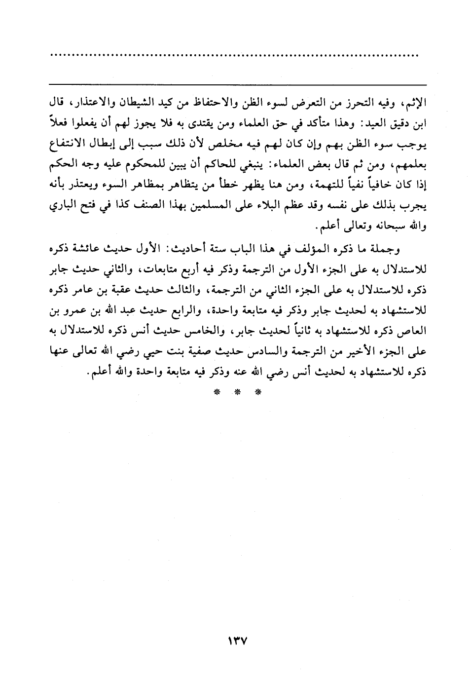 وجملة ما ذكره المؤلف في هذا الباب ستة أحاديث: الأول حديث عائشة ذكره للاستدلال به على الجزء الأول من الترجمة وذكر فيه أربع متابعات، والثاني حديث جابر ذكره للاستدلال به على الجزء الثاني من الترجمة، والثالث حديث عقبة بن عامر ذكره للاستشهاد به لحديث جابر وذكر فيه متابعة واحدة، والرابع حديث عبد الله بن عمرو بن العاص ذكره للاستشهاد به ثانيًا لحديث جابر، والخاص حديث أنس ذكره للاستدلال به على الجزء الأخير من الترجمة والسادس حديث صفية بنت حيي رضي الله تعالى عنها ذكره للاستشهاد به لحديث أنس رضي الله عنه وذكر فيه متابعة واحدة والله أعلم.