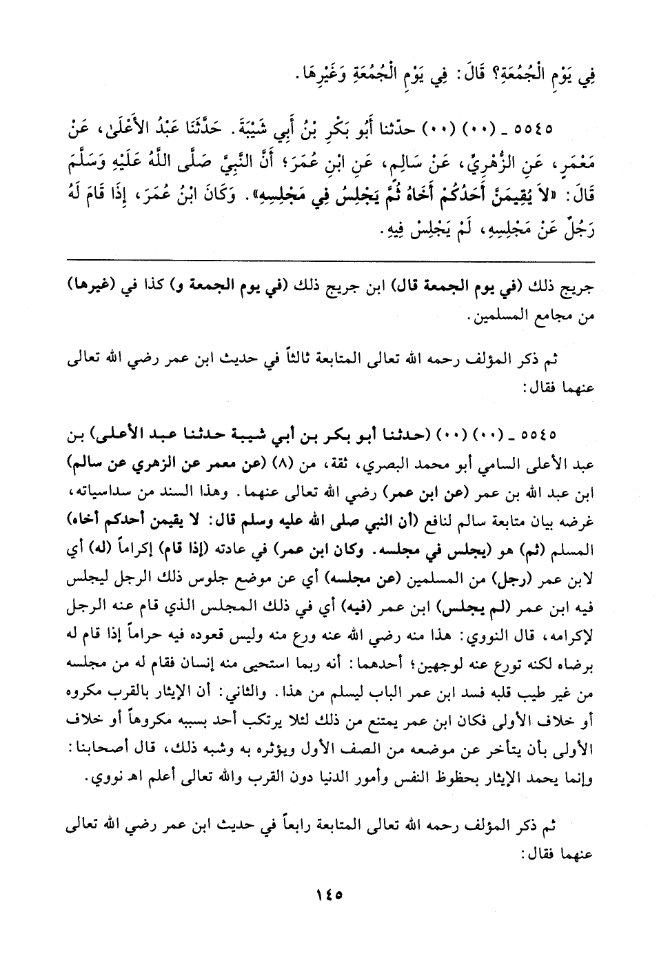 ٥٥٤٥ - (٠٠) (٠٠) حَدَّثَنَا أَبُو بَكْرِ بْنُ أَبِي شَيبَةَ. حَدَّثَنَا عَبْدُ الأَعْلَى، عَنْ مَعْمَرٍ، عَنِ الزُّهْرِيِّ، عَنْ سَالِمٍ، عَنِ ابْنِ عُمَرَ؛ أَنَّ النَّبِيَّ صلى الله عليه وسلم قَال: "لَا يُقِيمَنَّ أَحَدُكُمْ أَخَاهُ ثُمَّ يَجْلِسُ فِي مَجْلِسِهِ". وَكَانَ ابْنُ عُمَرَ, إِذَا قَامَ لَهُ رَجُلٌ عَنْ مَجْلِسِهِ, لَمْ يَجْلِسْ فِيهِ