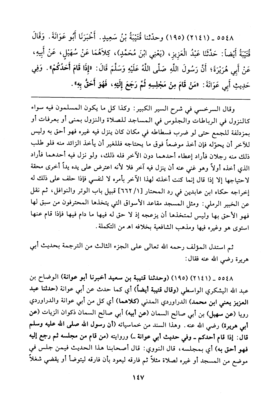 ٥٥٤٨ - (٢١٤١) (١٩٥) وَحَدَّثَنَا قُتَيبَةُ بْنُ سَعِيدٍ. أَخْبَرَنَا أَبُو عَوَانَةَ. وَقَال قُتَيبَةُ أَيضًا: حَدَّثَنَا عَبْدُ الْعَزِيزِ، (يَعْنِي ابْنَ مُحَمَّدٍ) , كِلاهُمَا عَنْ سُهَيلٍ، عَنْ أَبِيهِ، عَنْ أَبِي هُرَيرَةَ؛ أَنَّ رَسُولَ اللهِ صلى الله عليه وسلم قَال: "إِذَا قَامَ أَحَدُكُمْ". وَفِي حَدِيثِ أَبِي عَوَانَةَ: "مَنْ قَامَ مِنْ مَجْلِسِهِ ثُمَّ رَجَعَ إِلَيهِ, فَهُوَ أَحَقُّ بِهِ"