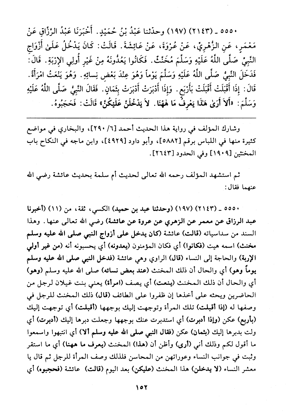 ٥٥٥٠ - (٢١٤٣) (١٩٧) وَحَدَّثَنَا عَبْدُ بْنُ حُمَيدٍ. أَخْبَرَنَا عَبْدُ الرَّزَّاقِ عَنْ مَعْمَرٍ، عَنِ الزُّهْرِيِّ، عَنْ عُرْوَةَ، عَنْ عَائِشَةَ. قَالتْ: كَانَ يَدْخُلُ عَلَى أَزْوَاجِ النَّبِيِّ صلى الله عليه وسلم مُخَنَّثٌ. فَكَانُوا يَعُدُّونَهُ مِنْ غَيرِ أُولِي الإِرْبَةِ. قَال: فَدَخَلَ النَّبِيُّ صلى الله عليه وسلم يَوْمًا وَهُوَ عِنْدَ بَعْضِ نِسَائِهِ. وَهُوَ يَنْعَتُ امْرَأَةً. قَال: إِذَا أَقْبَلَتْ أَقْبَلَتْ بِأَرْبَعٍ. وَإِذَا أَدْبَرَتْ أَدْبَرَتْ بِثَمَانٍ. فَقَال النَّبِيُّ صلى الله عليه وسلم: "أَلا أَرَى هَذَا يَعْرِفُ مَا هَا هُنَا. لَا يَدْخُلَنَّ عَلَيكُنَّ" قَالتْ: فَحَجَبُوهُ