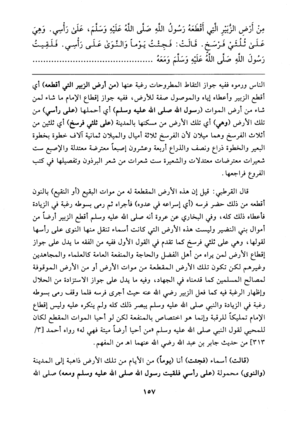 قال القرطبي: قيل إن هذه الأرض المقطعة له من موات البقيع (أو النقيع) بالنون أقطعه من ذلك حضر فرسه (أي إسراعه في عدوه) فأجراه ثم رمى بسوطه رغبة في الزيادة فأعطاه ذلك كله، وفي البخاري عن عروة أنه صلى الله عليه وسلم أقطع الزبير أرضًا من أموال بني النضير وليست هذه الأرض التي كانت أسماء تنقل منها النوى على رأسها لقولها، وهي على ثلثي فرسخ كما تقدم في القول الأول ففيه من الفقه ما يدل على جواز إقطاع الأرض لمن يراه من أهل الفضل والحاجة والمنفعة العامة كالعلماء والمجاهدين وغيرهم لكن تكون تلك الأرض المقطعة من موات الأرض أو من الأرض الموقوفة لمصالح المسلمين كما قدمناه في الجهاد، وفيه ما يدل على جواز الاستزادة من الحلال وإظهار الرغبة فيه كما فعل الزبير رضي الله عنه حيث أجرى فرسه فلما وقف رمى بسوطه رغبة في الزيادة والنبي صلى الله عليه وسلم يبصر ذلك كله ولم ينكره عليه وليس إقطاع الإمام تمليكًا للرقبة وإنما هو اختصاص بالمنفعة لكن لو أحيا الموات المقطع لكان للمحيي لقول النبي صلى الله عليه وسلم "من أحيا أرضًا ميتة فهي له" رواه أحمد [٣/ ٣١٣] من حديث جابر بن عبد الله رضي الله عنهما اهـ من المفهم.