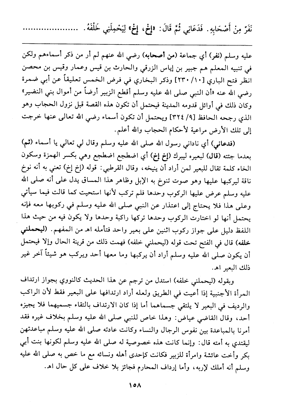 (فدعاني) أي ناداني رسول الله صلى الله عليه وسلم وقال لي تعالي يا أسماء (ثم) بعدما جئته (قال) لبعيره ليبرك (إخ إخ) أي اضطجع اضطجع وهي بكسر الهمزة وسكون الخاء كلمة تقال للبعير لمن أراد أن ينيخه، وقال القرطبي: قوله (إخ إخ) تعني به أنه نوخ ناقة ليركبها عليها وهو صوت تنوخ به الإبل وظاهر هذا المساق يدل على أنه صلى الله عليه وسلم عرض عليها الركوب وحدها فلم تركب لأنها استحيت كما قالت فيما سيأتي وعلى هذا فلا يحتاج إلى اعتذار عن النبي صلى الله عليه وسلم في ركوبها معه فإنه يحتمل أنها لو اختارت الركوب وحدها تركها راكبة وحدها ولا يكون فيه من حيث هذا اللفظ دليل على جواز ركوب اثنين على بعير واحد فتأمله اهـ من المفهم. (ليحملني خلفه) قال في الفتح تحت قوله (ليحملني خلفه) فهمت ذلك من قرينة الحال وإلا فيحتمل أن يكون صلى الله عليه وسلم أراد أن يركبها وما معها أحد ويركب هو شيئًا آخر غير ذلك البعير اهـ.
