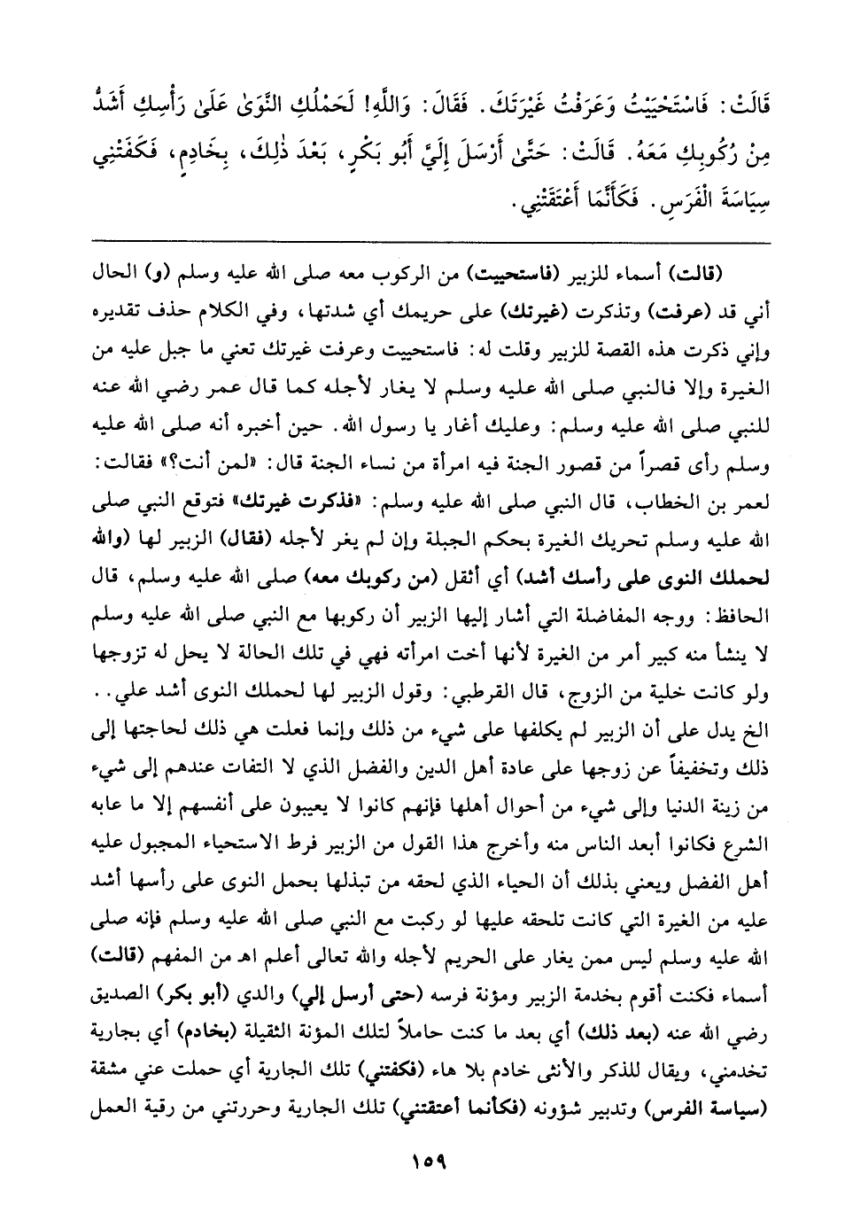 قَالتْ: فَاسْتَحْيَيتُ وَعَرَفْتُ غَيرَتَكَ. فَقَال: وَاللَّهِ! لَحَمْلُكِ النَّوَى عَلَى رَأْسِكِ أَشَدُّ مِنْ رُكُوبِكِ مَعَهُ. قَالتْ: حَتَّى أَرْسَلَ إِلَيَّ أَبُو بَكْرٍ, بَعْدَ ذَلِكَ, بِخَادِمٍ, فَكَفَتْنِي سِيَاسَةَ الْفَرَسِ. فَكَأَنَّمَا أَعْتَقَتْنِي