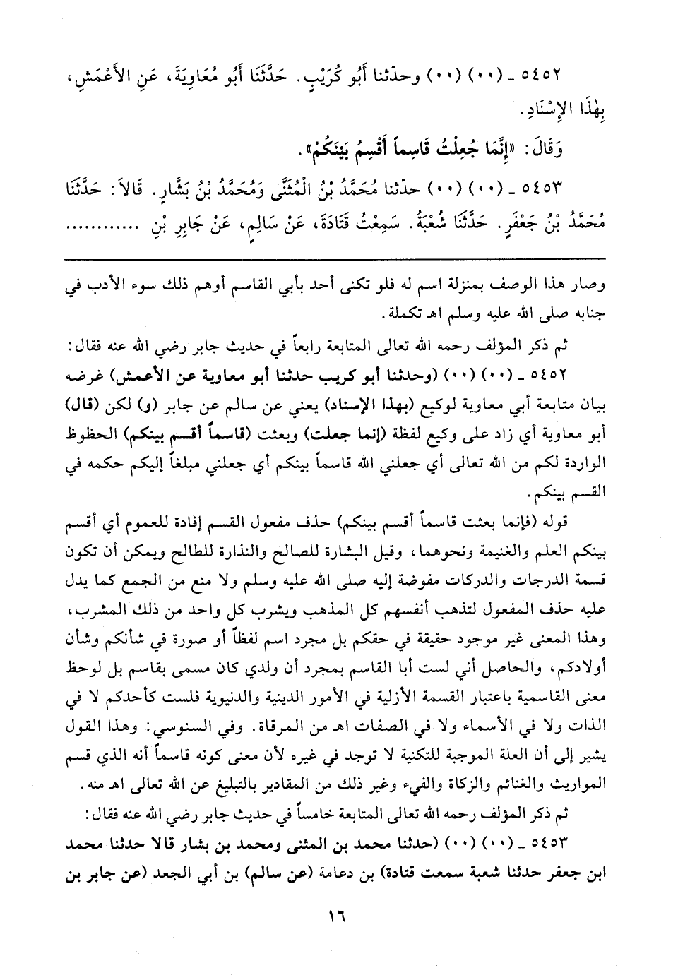 ٥٤٥٢ - (٠٠) (٠٠) (وحدثنا أبو كريب حدثنا أبو معاوية عن الأعمش) غرضه بيان متابعة أبي معاوية لوكيع (بهذا الإسناد) يعني عن سالم عن جابر (و) لكن (قال) أبو معاوية أي زاد على وكيع لفظة (إنما جعلت) وبعثت (قاسمًا أقسم بينكم) الحظوظ الواردة لكم من الله تعالى أي جعلني الله قاسمًا بينكم أي جعلني مبلغًا إليكم حكمه في القسم بينكم.