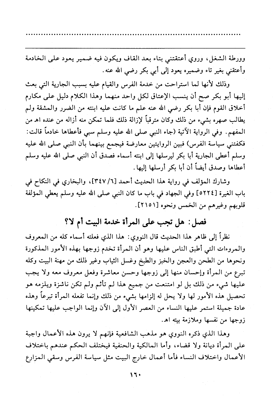 نظرًا إلى ظاهر هذا الحديث قال النووي: هذا الذي فعلته أسماء كله من المعروف والمروءات التي أطبق الناس عليها وهو أن المرأة تخدم زوجها بهذه الأمور المذكورة ونحوها من الطحن والعجن والخبز والطبخ وغسل الثياب وغير ذلك من مهنة البيت وكله تبرع من المرأة وإحسان منها إلى زوجها وحسن معاشرة وفعل معروف معه ولا يجب عليها شيء من ذلك بل لو امتنعت من جميع هذا لم تأثم ولم تكن ناشزة ويلزمه هو تحصيل هذه الأمور لها ولا يحل له إلزامها بشيء من ذلك وإنما تفعله المرأة تبرعًا وهذه عادة جميلة استمر عليها النساء من العصر الأول إلى الآن وإنما الواجب عليها تمكينها زوجها من نفسها وملازمة بيته اهـ.