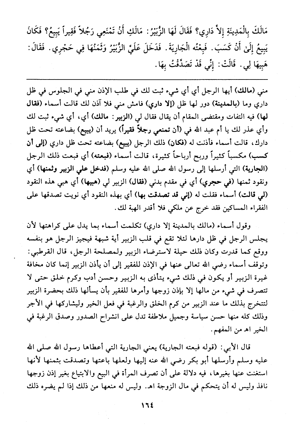 مني (ما لك) أيها الرجل أي أي شيء ثبت لك في طلب الإذن مني في الجلوس في ظل داري وما (بالمدينة) دور لها ظل (إلا داري) فامش مني فلا آذن لك قالت أسماء (فقال لها) فيه التفات ومقتضى المقام أن يقال فقال لي (الزبير: مالك) أي، أي شيء ثبت لك وأي عذر لك يا أم عبد الله في (أن تمنعي رجلًا ففيرًا) يريد أن (يبيع) بضاعته تحت ظل دارك، قالت أسماء فأذنت له (فكان) ذلك الرجل (يبيع) بضاعته تحت ظل داري (إلى أن كسب) مكسبًا كثيرًا وربح أرباحًا كثيرة، قالت أسماء (فبعته) أي فبعت ذلك الرجل (الجارية) التي أرسلها إلى رسول الله صلى الله عليه وسلم (فدخل علي الزبير وثمنها) أي ونقود ثمنها (في حجري) أي في مقدم بدني (فقال) الزبير لي (هبيها) أي هبي هذه النقود (لي قالت) أسماء فقلت له (إني قد تصدقت بها) أي بهذه النقود أي نويت تصدقها على الفقراء المساكين فقد خرج عن ملكي فلا أقدر الهبة لك.