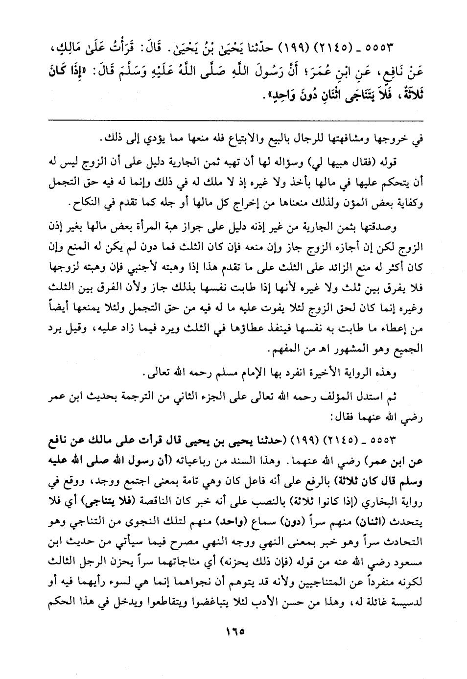 ٥٥٥٣ - (٢١٤٥) (١٩٩) حَدَّثَنَا يَحْيَى بْنُ يَحْيَى. قَال: قَرَأْتُ عَلَى مَالِكٍ, عَنْ نَافِعٍ، عَنِ ابْنِ عُمَرَ؛ أَنَّ رَسُولَ اللهِ صلى الله عليه وسلم قَال: "إِذَا كَانَ ثَلاثَةٌ, فَلَا يَتَنَاجَى اثْنَانِ دُونَ وَاحِدٍ"