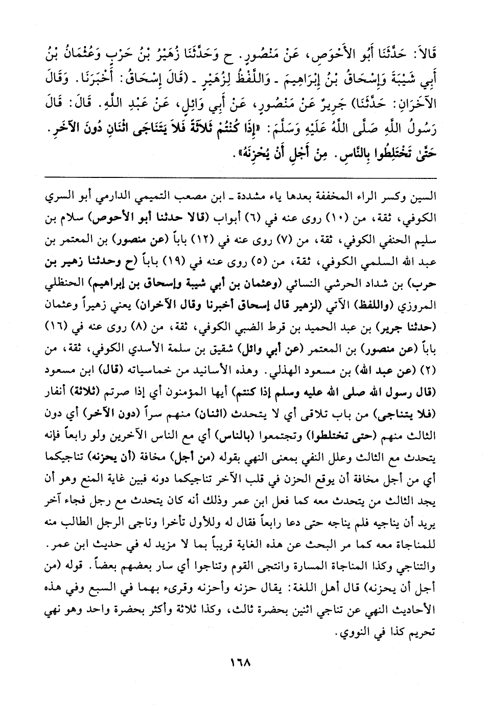 قَالا: حَدَّثَنَا أَبُو الأَخْوَصِ، عَنْ مَنْصُورٍ. ح وَحدَّثَنَا زُهَيرُ بن حَرْبٍ وَعُثمَانُ بن أَبِي شَيبَةَ وَإِسْحَاقُ بن إِبْرَاهِيمَ - وَاللَّفظُ لِزُهَيرٍ - (قَال إِسْحَاقُ: أَخْبَرَنَا. وَقَال الآخَرَانِ: حَدَّثَنَا) جَرِير عَنْ مَنْصُورٍ، عَنْ أَبِي وَائِلٍ، عَنْ عَبْدِ اللهِ. قَال: قَال رَسُولُ اللهِ صَلَّى اللهُ عَلَيهِ وَسَلَّمَ: "إِذَا كُنْتُمْ ثَلَاثَةَ فَلَا يَتَنَاجَى اثنَانِ دُونَ الآخَرِ. حَتَّى تَخْتَلِطُوا بِالنَّاسِ. مِنْ أَجْلِ أَنْ يُحْزِنَهُ"