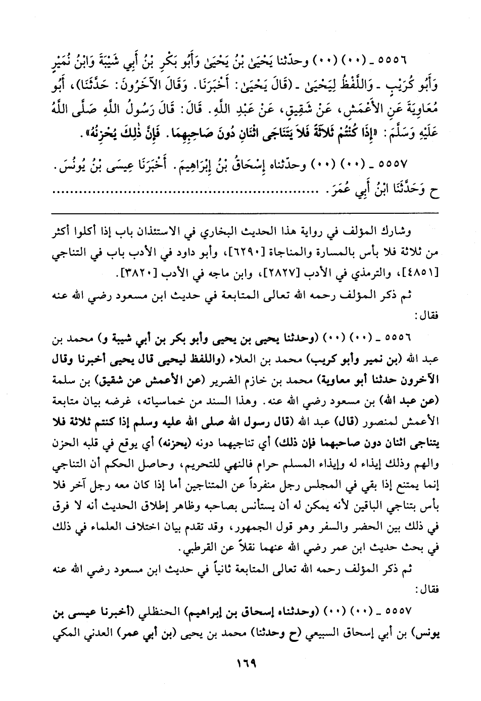 ٥٥٥٦ - (٠٠) (٠٠) (وحدثنا يحيى بن يحيى وأبو بكر بن أبي شيبة و) محمد بن عبد الله (بن نمير وأبو كريب) محمد بن العلاء (واللفظ ليحيى قال يحيى أخبرنا وقال الآخرون حَدَّثَنَا أبو معاوية) محمد بن خازم الضرير (عن الأعمش عن شقيق) بن سلمة (عن عبد الله) بن مسعود رضي الله عنه. وهذا السند من خماسياته، غرضه بيان متابعة الأعمش لمنصور (قال) عبد الله (قال رسول الله صلى الله عليه وسلم إذا كنتم ثلاثة فلا يتناجى اثنان دون صاحبهما فإن ذلك) أي تناجيهما دونه (يحزنه) أي يوقع في قلبه الحزن والهم وذلك إيذاء له هايذاء المسلم حرام فالنهي للتحريم، وحاصل الحكم أن التناجي إنما يمتنع إذا بقي في المجلس رجل منفردًا عن المتناجين أما إذا كان معه رجل آخر فلا بأس بتناجي الباقين لأنه يمكن له أن يستأنس بصاحبه وظاهر إطلاق الحديث أنَّه لا فرق في ذلك بين الحضر والسفر وهو قول الجمهور، وقد تقدم بيان اختلاف العلماء في ذلك في بحث حديث ابن عمر رضي الله عنهما نقلًا عن القرطبي.