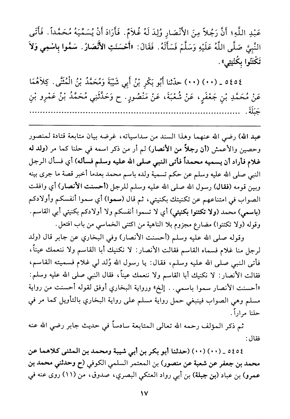 عَبْدِ الله؛ أَنَّ رَجُلًا مِنَ الأنْصَارِ وُلدَ لَهُ غُلامٌ. فأرَادَ أَنْ يُسَمِّيَهُ مُحمَّدًا. فأَتَى النَّبِيَّ صَلَّى اللهُ عَلَيهِ وَسَلمَ فَسَألَهُ. فَقَال: "أَحسَنَتِ الأَنصَارُ. سَمُّوا بِاسْمِي وَلَا تَكْتَنُوا بِكُنْيَتِي".
