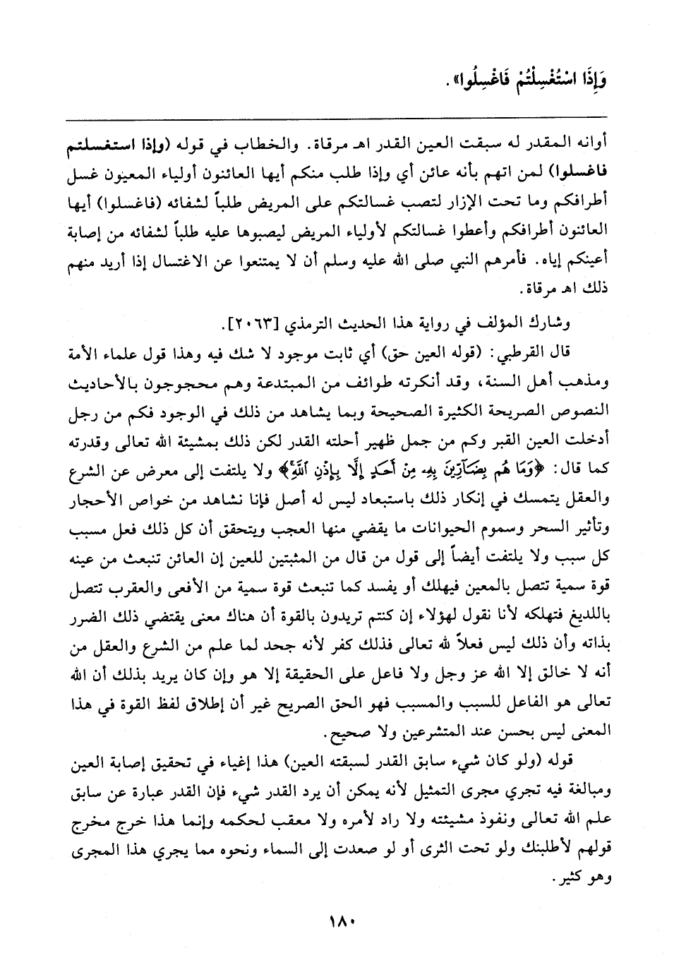 قال القرطبي: (قوله العين حق) أي ثابت موجود لا شك فيه وهذا قول علماء الأمة ومذهب أهل السنة، وقد أنكرته طوائف من المبتدعة وهم محجوجون بالأحاديث النصوص الصريحة الكثيرة الصحيحة وبما يشاهد من ذلك في الوجود فكم من رجل أدخلت العين القبر وكم من جمل ظهير أحلته القدر لكن ذلك بمشيئة الله تعالى وقدرته كما قال: {وَمَا هُمْ بِضَارِّينَ بِهِ مِنْ أَحَدٍ إلَّا بِإِذْنِ اللهِ} ولا يلتفت إلى معرض عن الشرع والعقل يتمسك في إنكار ذلك باستبعاد ليس له أصل فإنا نشاهد من خواص الأحجار وتأثير السحر وسموم الحيوانات ما يقضي منها العجب ويتحقق أن كل ذلك فعل مسبب كل سبب ولا يلتفت أيضًا إلى قول من قال من المثبتين للعين إن العائن تنبعث من عينه قوة سمية تتصل بالمعين فيهلك أو يفسد كما تنبعث قوة سمية من الأفعى والعقرب تتصل باللديغ فتهلكه لأنا نقول لهؤلاء إن كنتم تريدون بالقوة أن هناك معنى يقتضي ذلك الضرر بذاته وأن ذلك ليس فعلًا لله تعالى فذلك كفر لأنه جحد لما علم من الشرع والعقل من أنَّه لا خالق إلَّا الله عزَّ وجلَّ ولا فاعل على الحقيقة إلَّا هو وإن كان يريد بذلك أن الله تعالى هو الفاعل للسبب والمسبب فهو الحق الصريح غير أن إطلاق لفظ القوة في هذا المعنى ليس بحسن عند المتشرعين ولا صحيح.