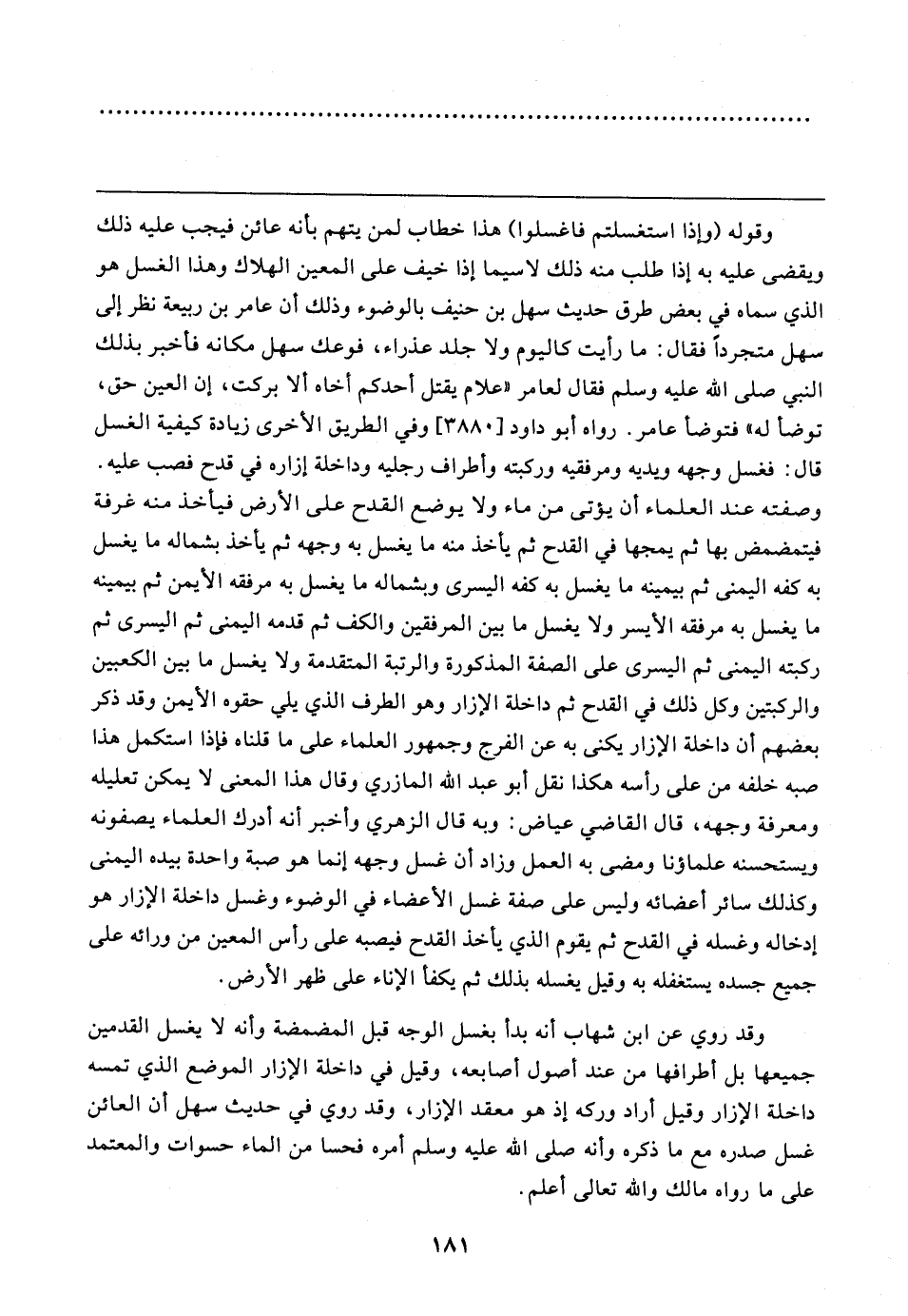 وقد روي عن ابن شهاب أنَّه بدأ بغسل الوجه قبل المضمضة وأنه لا يغسل القدمين جميعها بل أطرافها من عند أصول أصابعه، وقيل في داخلة الإزار الموضع الَّذي تمسه داخلة الإزار وقيل أراد وركه إذ هو معقد الإزار، وقد روي في حديث سهل أن العائن غسل صدره مع ما ذكره وأنه صلى الله عليه وسلم أمره فحسا من الماء حسوات والمعتمد على ما رواه مالك والله تعالى أعلم.