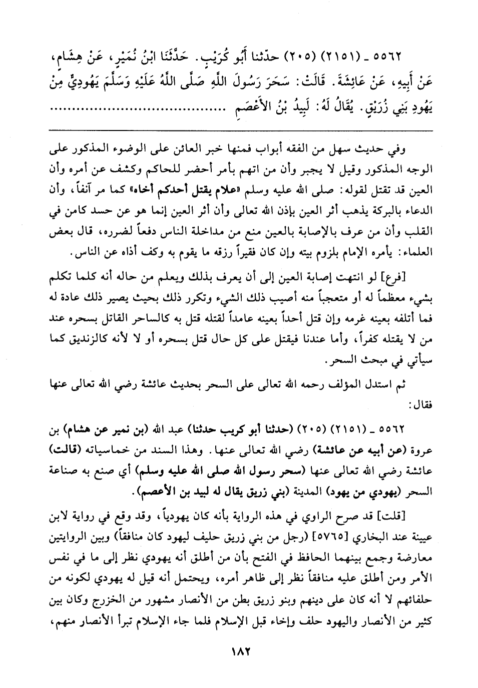 ٥٥٦٢ - (٢١٥١) (٢٠٥) (حَدَّثَنَا أبو كريب حَدَّثَنَا) عبد الله (بن نمير عن هشام) بن عروة (عن أبيه عن عائشة) رضي الله تعالى عنها. وهذا السند من خماسياته (قالت) عائشة رضي الله تعالى عنها (سحر رسول الله صلى الله عليه وسلم) أي صنع به صناعة السحر (يهودي من يهود) المدينة (بني زريق يقال له لبيد بن الأعصم).