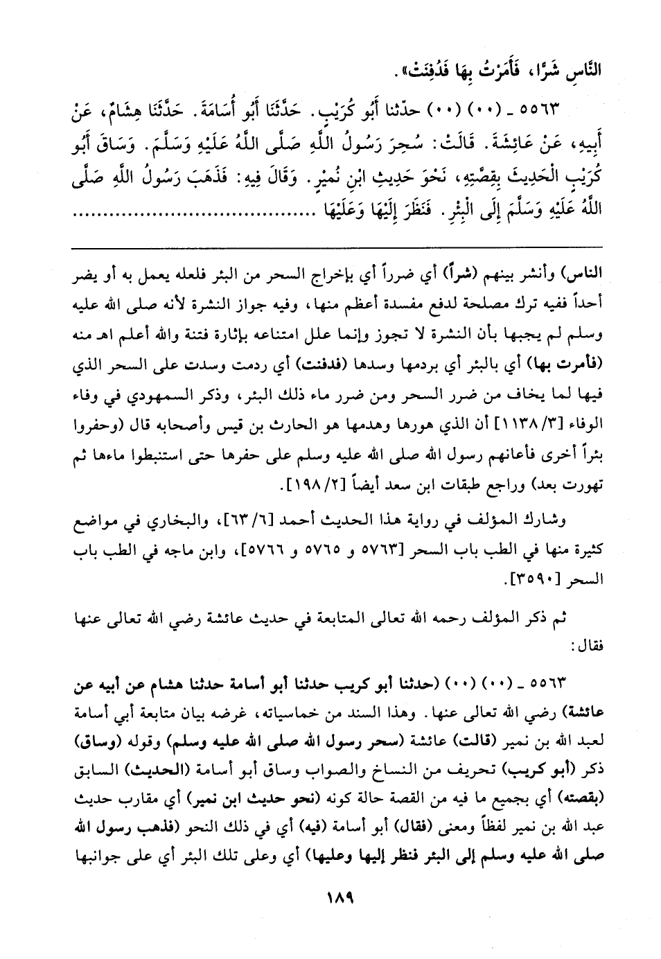 ٥٥٦٣ - (٠٠) (٠٠) (حَدَّثَنَا أبو غريب حَدَّثَنَا أبو أسامة حَدَّثَنَا هشام عن أبيه عن عائشة) رضي الله تعالى عنها. وهذا السند من خماسياته، غرضه بيان متابعة أبي أسامة لعبد الله بن نمير (قالت) عائشة (سحر رسول الله صلى الله عليه وسلم) وقوله (وساق) ذكر (أبو غريب) تحريف من النساخ والصواب وساق أبو أسامة (الحديث) السابق (بقصته) أي بجميع ما فيه من القصة حالة كونه (نحو حديث ابن نمير) أي مقارب حديث عبد الله بن نمير لفظًا ومعنى (فقال) أبو أسامة (فيه) أي في ذلك النحو (فذهب رسول الله صلى الله عليه وسلم إلى البئر فنظر إليها وعليها) أي وعلى تلك البئر أي على جوانبها