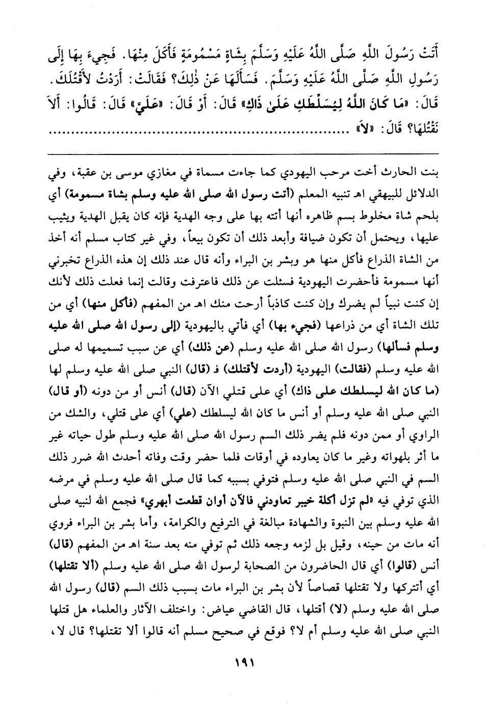 أَتَتْ رَسُولَ اللهِ صَلَّى اللهُ عَلَيهِ وَسَلَّمَ بِشَاةٍ مَسْمُومَةٍ فَأَكَلَ مِنْهَا. فَجِيءَ بِهَا إِلَى رَسُولِ اللهِ صَلَّى اللهُ عَلَيهِ وَسَلَّمَ. فَسَأَلَهَا عَنْ ذلِكَ؟ فَقَالتْ: أَرَدْتُ لأَقْتُلَكَ. قَال: "مَا كَانَ اللهُ لِيُسَلِّطَكِ عَلَى ذَاكِ" قَال: أَوْ قَال: "عَلَيَّ" قَال: قَالُوا: أَلَا نَقْتُلهَا؟ قَال: "لَا"