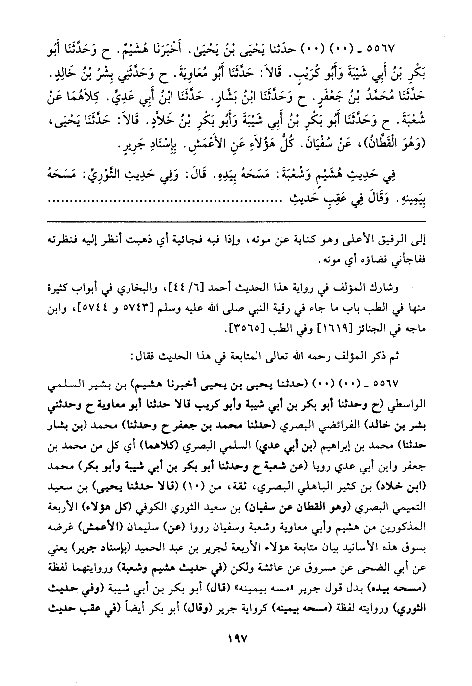 ٥٥٦٧ - (٠٠) (٠٠) (حَدَّثَنَا يحيى بن يحيى أخبرنا هشيم) بن بشير السلمي الواسطي (ح وحدثنا أبو بكر بن أبي شيبة وأبو غريب قالا حَدَّثَنَا أبو معاوية ح وحدثني بشر بن خالد) الفرائضي البصري (حَدَّثَنَا محمد بن جعفر ح وحدثنا) محمد (بن بشار حَدَّثَنَا) محمد بن إبراهيم (بن أبي عدي) السلمي البصري (كلاهما) أي كل من محمد بن جعفر وابن أبي عدي رويا (عن شعبة ح وحدثنا أبو بكر بن أبي شيبة وأبو بكر) محمد (ابن خلاد) بن كثير الباهلي البصري، ثقة، من (١٠) (قالا حَدَّثَنَا يحيى) بن سعيد التميمي البصري (وهو القطان عن سفيان) بن سعيد الثوري الكوفي (كل هؤلاء) الأربعة المذكورين من هشيم وأبي معاوية وشعبة وسفيان رووا (عن) سليمان (الأعمش) غرضه بسوق هذه الأسانيد بيان متابعة هؤلاء الأربعة لجرير بن عبد الحميد (بإسناد جرير) يعني عن أبي الضحى عن مسروق عن عائشة ولكن (في حديث هشيم وشعبة) وروايتهما لفظة (مسحه بيده) بدل قول جرير "مسه بيمينه" (قال) أبو بكر بن أبي شيبة (وفي حديث الثوري) وروايته لفظة (مسحه بيمينه) كرواية جرير (وقال) أبو بكر أيضًا (في عقب حديث