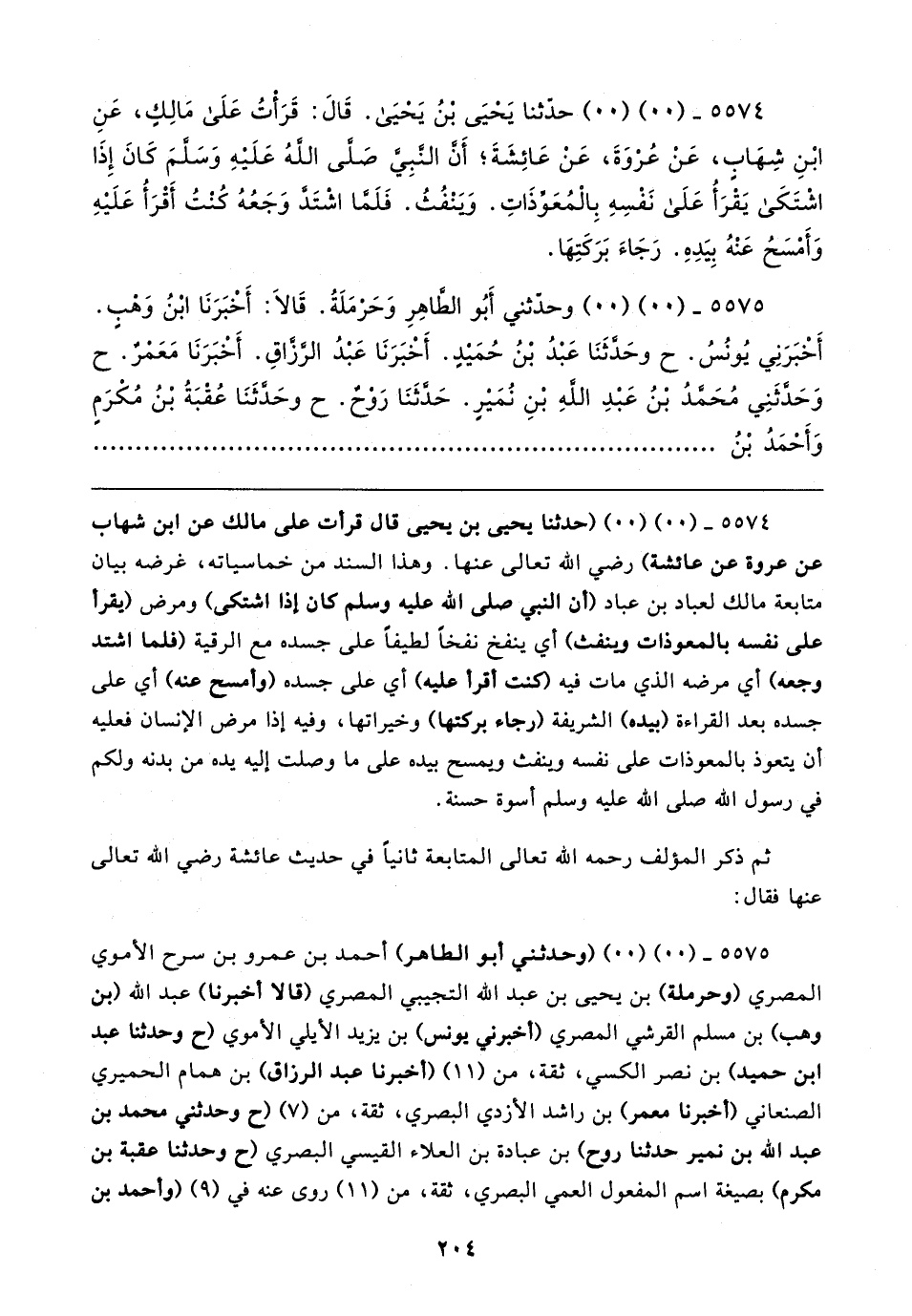 ٥٥٧٤ - (٠٠) (٠٠) حدَّثنا يَحْيَى بن يَحْيَى. قَال: قَرَأتُ عَلَى مَالِكٍ، عَنِ ابْنِ شِهَابٍ، عَنْ عُرْوَةَ، عَنْ عَائِشَةَ؛ أَنَّ النَّبِيّ صَلَّى اللهُ عَلَيهِ وَسَلَّمَ كَانَ إِذَا اشْتَكَى يَقرَأُ عَلَى نَفْسِهِ بِالْمُعَوِّذَاتِ. وَيَنْفُثُ. فَلَمَّا اشْتَدَّ وَجَعُهُ كُنْتُ أَقْرَأُ عَلَيهِ وَأَمْسَحُ عَنْهُ بِيَدِهِ. رَجَاءَ بَرَكَتِهَا.