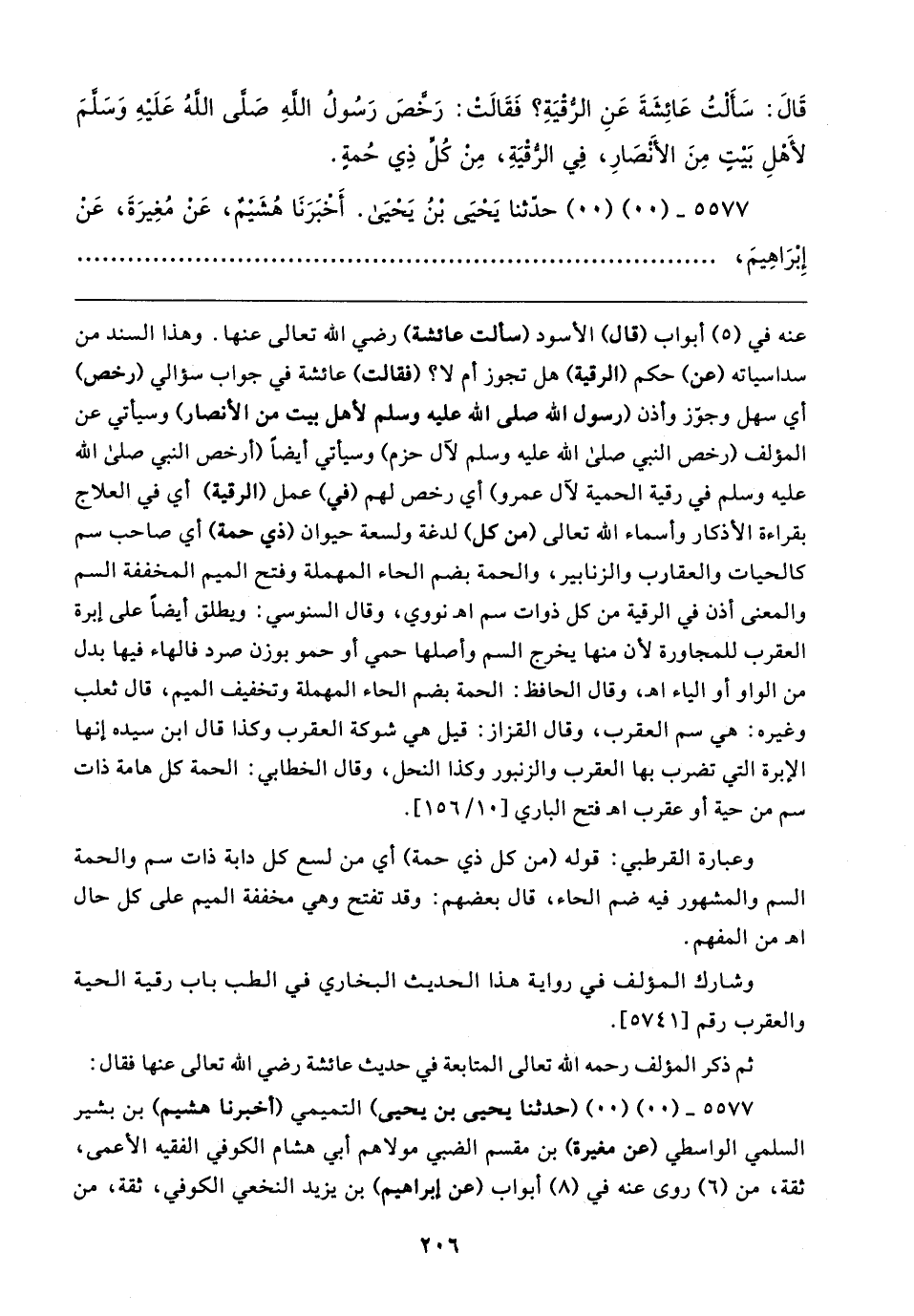عنه في (٥) أبواب (قال) الأسود (سألت عائشة) رضي الله تعالى عنها. وهذا السند من سداسياته (عن) حكم (الرقية) هل تجوز أم لا؟ (فقالت) عائشة في جواب سؤالي (رخص) أي سهل وجوَّز وأذن (رسول الله صلى الله عليه وسلم لأهل بيت من الأنصار) وسيأتي عن المؤلف (رخص النبي صلى الله عليه وسلم لآل حزم) وسيأتي أيضًا (أرخص النبي صلى الله عليه وسلم في رقية الحمية لآل عمرو) أي رخص لهم (في) عمل (الرقية) أي في العلاج بقراءة الأذكار وأسماء الله تعالى (من كل) لدغة ولسعة حيوان (ذي حمة) أي صاحب سم كالحيات والعقارب والزنابير، والحمة بضم الحاء المهملة وفتح الميم المخففة السم والمعنى أذن في الرقية من كل ذوات سم اهـ نووي، وقال السنوسي: ويطلق أيضًا على إبرة العقرب للمجاورة لأن منها يخرج السم وأصلها حمي أو حمو بوزن صرد فالهاء فيها بدل من الواو أو الياء اهـ، وقال الحافظ: الحمة بضم الحاء المهملة وتخفيف الميم، قال ثعلب وغيره: هي سم العقرب، وقال القزاز: قيل هي شوكة العقرب وكذا قال ابن سيده إنها الإبرة التي تضرب بها العقرب والزنبور وكذا النحل، وقال الخطابي: الحمة كل هامة ذات سم من حية أو عقرب اهـ فتح الباري [١٠/ ١٥٦].