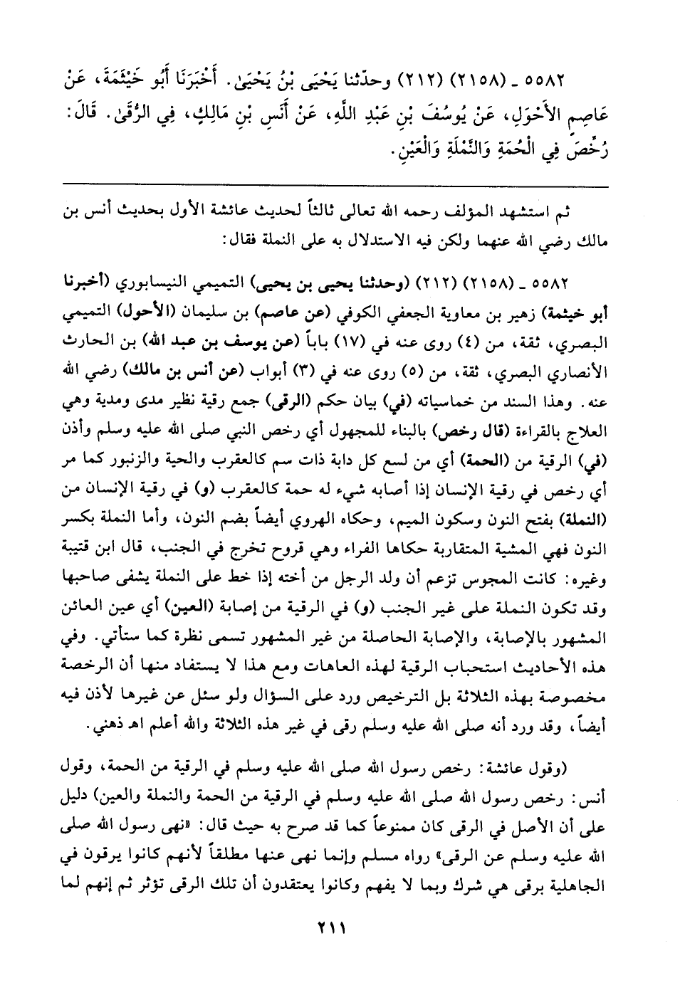 ٥٥٨٢ - (٢١٥٨) (٢١٢) (وحدثنا يحيى بن يحيى) التميمي النيسابوري (أخبرنا أبو خيثمة) زهير بن معاوية الجعفي الكوفي (عن عاصم) بن سليمان (الأحول) التميمي البصري، ثقة، من (٤) روى عنه في (١٧) بابا (عن يوسف بن عبد الله) بن الحارث الأنصاري البصري، ثقة، من (٥) روى عنه في (٣) أبواب (عن أنس بن مالك) رضي الله عنه. وهذا السند من خماسياته (في) بيان حكم (الرقى) جمع رقية نظير مدى ومدية وهي العلاج بالقراءة (قال رخص) بالبناء للمجهول أي رخص النبي صلى الله عليه وسلم وأذن (في) الرقية من (الحمة) أي من لسع كل دابة ذات سم كالعقرب والحية والزنبور كماو أي رخص في رقية الإنسان إذا أصابه شيء له حمة كالعقرب (و) في رقية الإنسان من (النملة) بفتح النون وسكون الميم، وحكاه الهروي أيضًا بضم النون، وأما النملة بكسر النون فهي المشية المتقاربة حكاها الفراء وهي قروح تخرج في الجنب، قال ابن قتيبة وغيره: كانت المجوس تزعم أن ولد الرجل من أخته إذا خط على النملة يشفى صاحبها وقد تكون النملة على غير الجنب (و) في الرقية من إصابة (العين) أي عين العائن المشهور بالإصابة، والإصابة الحاصلة من غير المشهور تسمى نظرة كما ستأتي. وفي هذه الأحاديث استحباب الرقية لهذه العاهات ومع هذا لا يستفاد منها أن الرخصة مخصوصة بهذه الثلاثة بل الترخيص ورد على السؤال ولو سئل عن غيرها لأذن فيه أيضًا، وقد ورد أنَّه صلى الله عليه وسلم رقى في غير هذه الثلاثة والله أعلم اهـ ذهني.