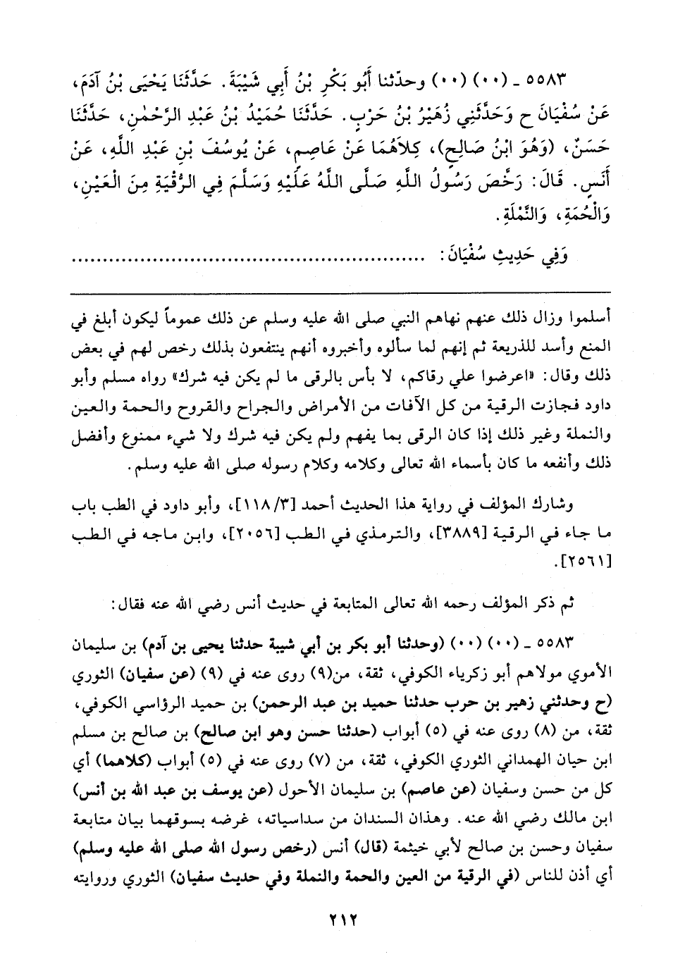 ٥٥٨٣ - (٠٠) (٥٥) (وحدثنا أبو بكر بن أبي شيبة حَدَّثَنَا يحيى بن آم) بن سليمان الأموي مولاهم أبو زكرياء الكوفي، ثقة، من (٩) روى عنه في (٩) (عن سفيان) الثوري (ح وحدثني زهير بن حرب حَدَّثَنَا حميد بن عبد الرحمن) بن حميد الرؤاسي الكوفي، ثقة، من (٨) روى عنه في (٥) أبواب (حَدَّثَنَا حسن وهو ابن صالح) بن صالح بن مسلم بن حيان الهمداني الثوري الكوفي، ثقة، من (٧) روى عنه في (٥) أبواب كلاهما) أي كل من حسن وسفيان (عن عاصم) بن سليمان الأحول (عن يوسف بن عبد الله بن أنس) ابن مالك رضي الله عنه. وهذان السندان من سداسياته، غرضه بسوقهما بيان متابعة سفيان وحسن بن صالح لأبي خيثمة (قال) أنس (رخص رسول الله صلى الله عليه وسلم) أي أذن للناس (في الرقية من العين والحمة والنملة وفي حديث سفيان) الثوري وروايته