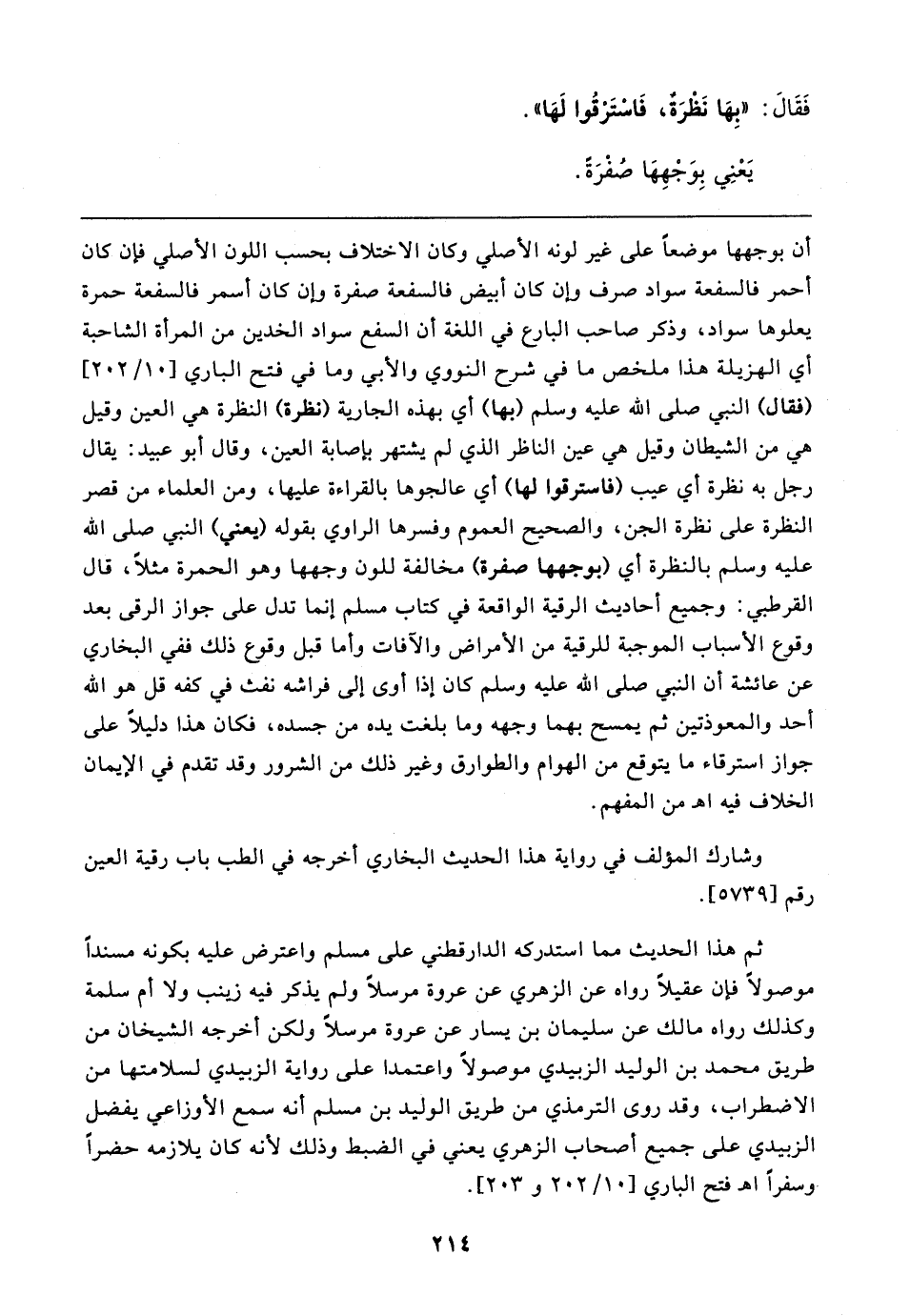 أن بوجهها موضعًا على غير لونه الأصلي وكان الاختلاف بحسب اللون الأصلي فإن كان أحمر فالسفعة سواد صرف وإن كان أبيض فالسفعة صفرة وإن كان أسمر فالسفعة حمرة يعلوها سواد، وذكر صاحب البارع في اللغة أن السفع سواد الخدين من المرأة الشاحبة أي الهزيلة هذا ملخص ما في شرح النووي والأبي وما في فتح الباري [١٠/ ٢٠٢] (فقال) النبي صلى الله عليه وسلم (بها) أي بهذه الجارية (نظرة) النظرة هي العين وقيل هي من الشيطان وقيل هي عين الناظر الَّذي لم يشتهر بإصابة العين، وقال أبو عبيد: يقال رجل به نظرة أي عيب (فاسترقوا لها) أي عالجوها بالقراءة عليها، ومن العلماء من قصر النظرة على نظرة الجن، والصحيح العموم وفسرها الراوي بقوله (يعني) النبي صلى الله عليه وسلم بالنظرة أي (بوجهها صفرة) مخالفة للون وجهها وهو الحمرة مثلًا، قال القرطبي: وجميع أحاديث الرقية الواقعة في كتاب مسلم إنما تدل على جواز الرقى بعد وقوع الأسباب الموجبة للرقية من الأمراض والآفات وأما قبل وقوع ذلك ففي البخاري عن عائشة أن النبي صلى الله عليه وسلم كان إذا أوى إلى فراشه نفث في كفه قل هو الله أحد والمعوذتين ثم يمسح بهما وجهه وما بلغت يده من جسده، فكان هذا دليلًا على جواز استرقاء ما يتوقع من الهوام والطوارق وغير ذلك من الشرور وقد تقدم في الإيمان الخلاف فيه اهـ من المفهم.