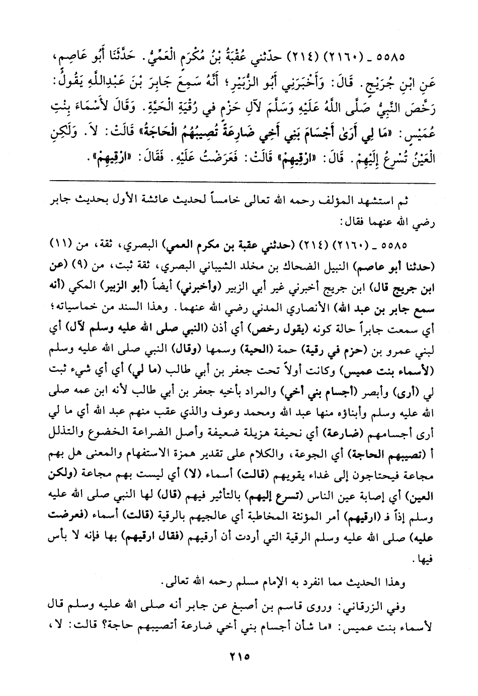 ٥٥٨٥ - (٢١٦٠) (٢١٤) حدَّثني عُقْبَةُ بن مُكرَمٍ الْعَمِّيُّ. حَدَّثَنَا أَبُو عَاصِمٍ، عَنِ ابْنِ جُرَيجٍ. قَال: وَأَخْبَرَنِي أَبُو الزُّبَيرِ؛ أَنَّهُ سَمِعَ جَابِرَ بْنَ عَبْدِ اللهِ يَقُولُ: رَخَّصَ النَّبِيُّ صَلَّى اللهُ عَلَيهِ وَسَلَّمَ لآلِ حَزْمٍ في رُقْيَةِ الْحَيَّةِ. وَقَال لأَسْمَاءَ بِنْتِ عُمَيسٍ: "مَا لِي أَرَى أَجْسَامَ بَنِي أَخِي ضَارِعَةً تُصِيبُهُمُ الْحَاجَةُ" قَالتْ: لَا. وَلَكنِ الْعَينُ تُسْرعُ إِلَيهِمْ. قَال: "ارْقِيهِمْ" قَالتْ: فَعَرَضْتُ عَلَيهِ. فَقَال: "ارْقِيهِمْ"