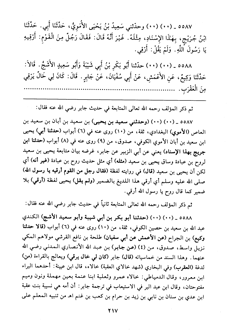 ٥٥٨٧ - (٠٠) (٠٠) (وحدثني سعيد بن يحيى) بن سعيد بن أبان بن سعيد بن العاص (الأموي) البغدادي، ثقة، من (١٠) روى عنه في (٦) أبواب (حَدَّثَنَا أبي) يحيى بن سعيد بن أبان الأموي الكوفي، صدوق، من (٩) روى عنه في (٨) أبواب (حَدَّثَنَا ابن جريج بهذا الإسناد) يعني عن أبي الزبير عن جابر، غرضه بيان متابعة يحيى بن سعيد لروح بن عبادة وساق يحيى بن سعيد (مثله) أي مثل حديث روح بن عبادة (غير أنَّه) أي لكن أن يحيى بن سعيد (قال) في روايته لفظة (فقال رجل من القوم أرقيه يا رسول الله) صلى الله عليه وسلم أي أرقي هذا اللديغ بالضمير (ولم يقل) يحيى لفظة (أرقي) بلا ضمير كما قال روح يا رسول الله أرقي.