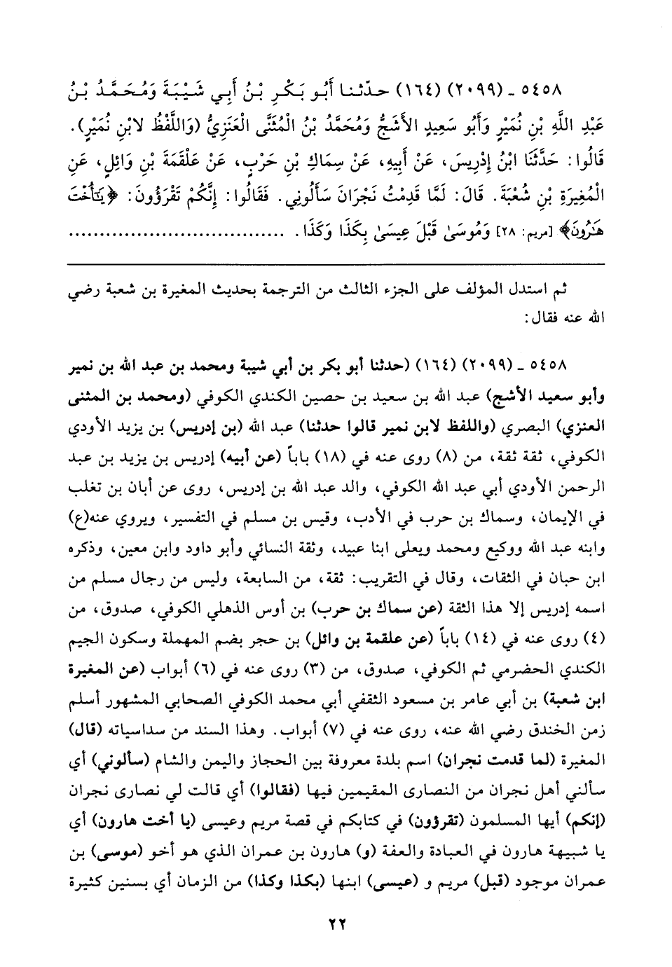 ٥٤٥٨ - (٢٠٩٩) (١٦٤) (حدثنا أبو بكر بن أبي شيبة ومحمد بن عبد الله بن نمير وأبو سعيد الأشج) عبد الله بن سعيد بن حصين الكندي الكوفي (ومحمد بن المثنى العنزي) البصري (واللفظ لابن نمير قالوا حدثنا) عبد الله (بن إدريس) بن يزيد الأودي الكوفي، ثقة ثقة، من (٨) روى عنه في (١٨) بابا (عن أبيه) إدريس بن يزيد بن عبد الرحمن الأودي أبي عبد الله الكوفي، والد عبد الله بن إدريس، روى عن أبان بن تغلب في الإيمان، وسماك بن حرب في الأدب، وقيس بن مسلم في التفسير، ويروي عنه (ع) وابنه عبد الله ووكيع ومحمد ويعلى ابنا عبيد، وثقة النسائي وأبو داود وابن معين، وذكره ابن حبان في الثقات، وقال في التقريب: ثقة، من السابعة، وليس من رجال مسلم من اسمه إدريس إلا هذا الثقة (عن سماك بن حرب) بن أوس الذهلي الكوفي، صدوق، من (٤) روى عنه في (١٤) بابا (عن علقمة بن وائل) بن حجر بضم المهملة وسكون الجيم الكندي الحضرمي ثم الكوفي، صدوق، من (٣) روى عنه في (٦) أبواب (عن المغيرة بن شعبة) بن أبي عامر بن مسعود الثقفي أبي محمد الكوفي الصحابي المشهور أسلم زمن الخندق رضي الله عنه، روى عنه في (٧) أبواب. وهذا السند من سداسياته (قال) المغيرة (لما قدمت نجران) اسم بلدة معروفة بين الحجاز واليمن والشام (سألوني) أي سألني أهل نجران من النصارى المقيمين فيها (فقالوا) أي قالت في نصارى نجران (إنكم) أيها المسلمون (تقرؤون) في كتابكم في قصة مريم وعيسى (يا أخت هارون) أي يا شبيهة هارون في العبادة والعفة (و) هارون بن عمران الذي هو أخو (موسى) بن عمران موجود (قبل) مريم و (عيسى) ابنها (بكذا وكذا) من الزمان أي بسنين كثيرة