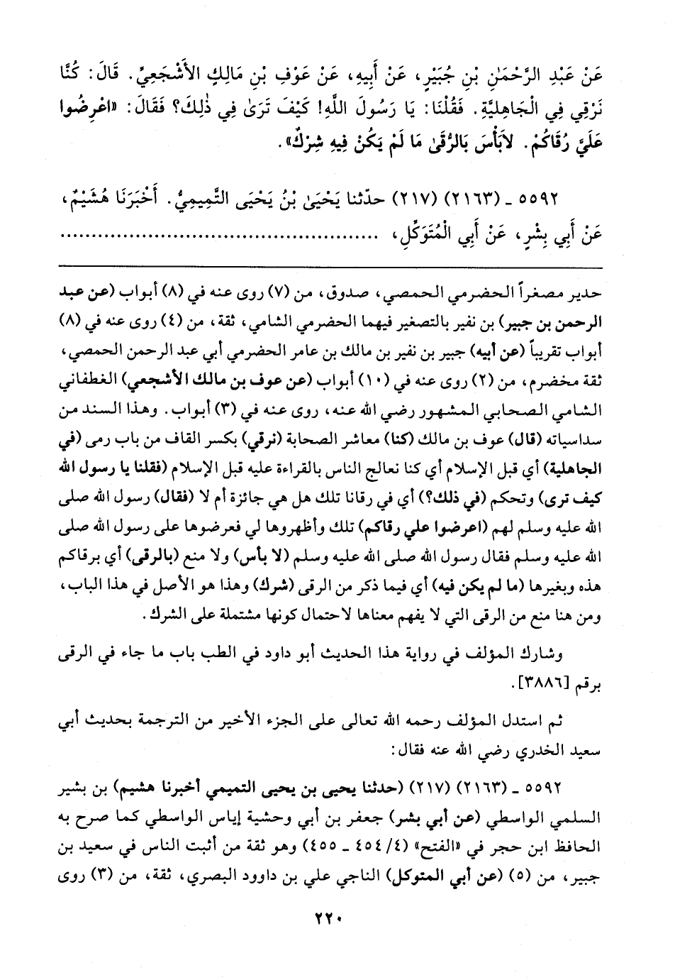 حدير مصغرًا الحضرمي الحمصي، صدوق، من (٧) روى عنه في (٨) أبواب (عن عبد الرحمن بن جبير) بن نفير بالتصغير فيهما الحضرمي الشامي، ثقة، من (٤) روى عنه في (٨) أبواب تقريبًا (عن أبيه) جبير بن نفير بن مالك بن عامر الحضرمي أبي عبد الرحمن الحمصي، ثقة مخضرم، من (٢) روى عنه في (١٠) أبواب (عن عوف بن مالك الأشجعي) الغطفاني الشامي الصحابي المشهور رضي الله عنه، روى عنه في (٣) أبواب. وهذا السند من سداسياته (قال) عوف بن مالك (كنا) معاشر الصحابة (نرقي) بكسر القاف من باب رمى (في الجاهلية) أي قبل الإسلام أي كنا نعالج الناس بالقراءة عليه قبل الإسلام (فقلنا يا رسول الله كيف ترى) وتحكم (في ذلك؟ ) أي في رقانا تلك هل هي جائزة أم لا (فقال) رسول الله صلى الله عليه وسلم لهم (أعرضوا علي رقاكم) تلك وأظهروها لي فعرضوها على رسول الله صلى الله عليه وسلم فقال رسول الله صلى الله عليه وسلم (لا بأس) ولا منع (بالرقى) أي برقاكم هذه وبغيرها (ما لم يكن فيه) أي فيما ذكر من الرقى (شرك) وهذا هو الأصل في هذا الباب، ومن هنا منع من الرقى التي لا يفهم معناها لاحتمال كونها مشتملة على الشرك.
