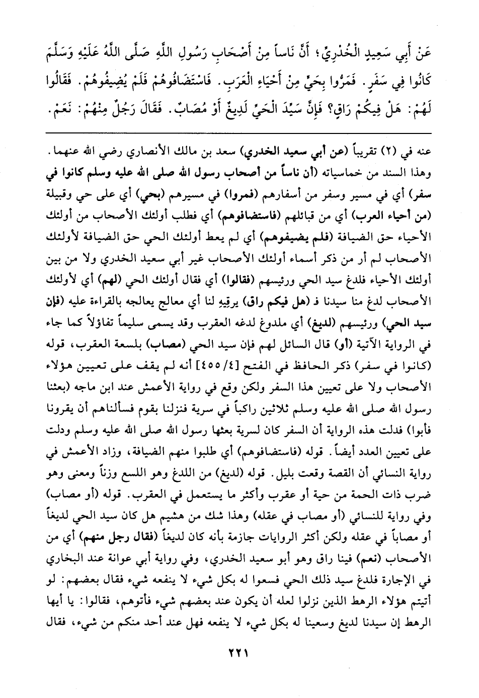 عَنْ أَبِي سَعِيدٍ الْخُدْرِيِّ؛ أَنَّ نَاسًا مِنْ أَصْحَابِ رَسُولِ اللهِ صَلَّى اللهُ عَلَيهِ وَسَلَّمَ كَانُوا في سَفَرِ. فَمَرُّوا بِحَيٍّ مِنْ أَحْيَاءِ الْعَرَبِ. فَاسْتَضَافُوهُمْ فَلَمْ يُضِيفُوهُمْ. فَقَالُوا لَهُمْ: هَل فِيكُمْ رَاقٍ؟ فَإنَّ سَيِّدَ الحَيِّ لَدِيغٌ أَوْ مُصَابٌ. فَقَال رَجُل مِنْهُمْ: نَعَمْ