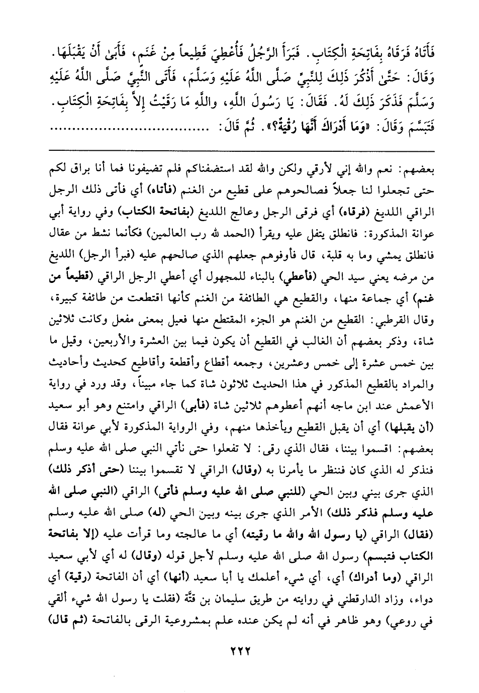 فَأَتَاهُ فَرَقَاهُ بِفَاتِحَةِ الْكِتَابِ. فَبَرَأ الرَّجُلُ فَأُعْطِيَ قَطِيعًا مِنْ غَنَمٍ، فَأَبَى أَنْ يَقْبَلَهَا. وَقَال: حَتَّى أَذْكُرَ ذَلِكَ لِلنَّبِيِّ صَلَّى اللهُ عَلَيهِ وَسَلَّمَ، فَأَتَى النَّبِيّ صَلَّى اللهُ عَلَيهِ وَسَلَّمَ فَذَكَرَ ذَلِكَ لَهُ. فَقَال: يَا رَسُولَ اللهِ، واللهِ مَا رَقَيتُ إلا بِفَاتِحَةِ الْكِتَابِ. فَتَبَسَّمَ وَقَال: "وَمَا أَدْرَاكَ أَنَّهَا رُقْيَةٌ؟ ! . ثُمَّ قَال: