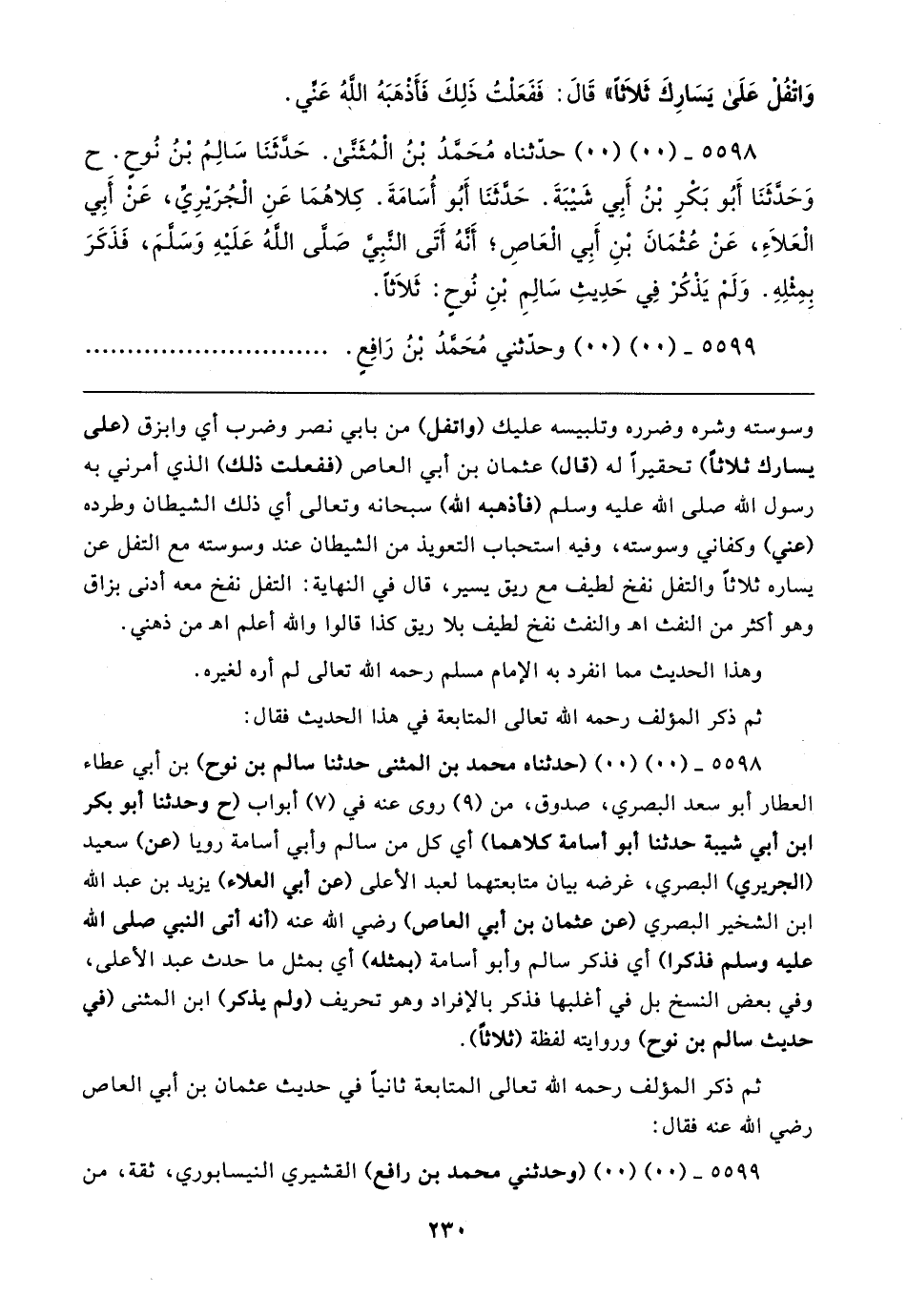 ٥٥٩٨ - (٠٠) (٠٠) (حدثناه محمد بن المثنى حَدَّثَنَا سالم بن نوح) بن أبي عطاء العطار أبو سعد البصري، صدوق، من (٩) روى عنه في (٧) أبواب (ح وحدثنا أبو بكر بن أبي شيبة حَدَّثَنَا أبو أسامة كلاهما) أي كل من سالم وأبي أسامة رويا (عن) سعيد (الجريري) البصري، غرضه بيان متابعتهما لعبد الأعلى (عن أبي العلاء) يزيد بن عبد الله بن الشخير البصري (عن عثمان بن أبي العاص) رضي الله عنه (أنَّه أتى النبي صلى الله عليه وسلم فذكرا) أي فذكر سالم وأبو أسامة (بمثله) أي بمثل ما حدث عبد الأعلى، وفي بعض النسخ بل في أغلبها فذكر بالإفراد وهو تحريف (ولم يذكر) ابن المثنى (في حديث سالم بن نوح) وروايته لفظة (ثلاثًا).