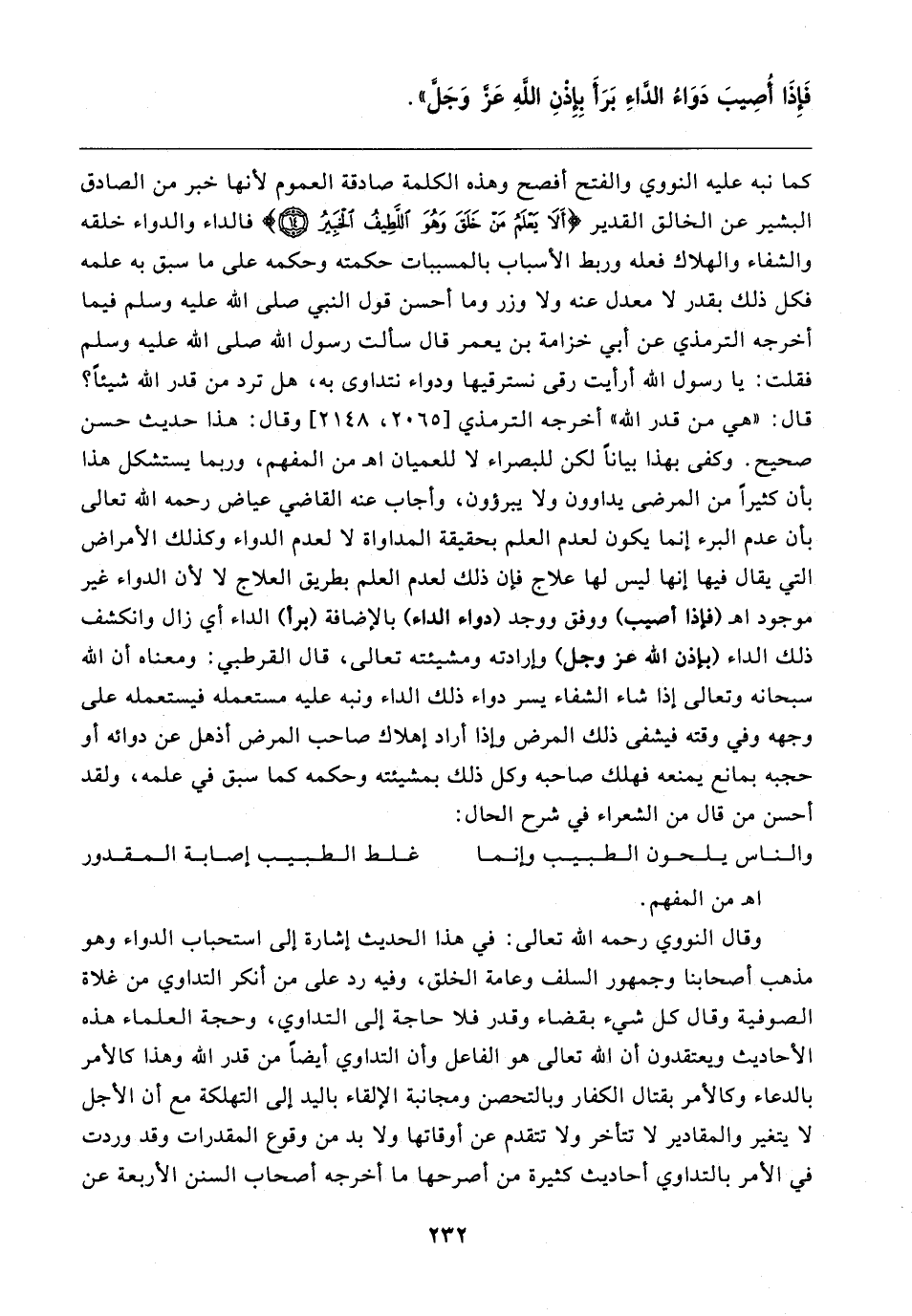 وقال النووي رحمه الله تعالى: في هذا الحديث إشارة إلى استحباب الدواء وهو مذهب أصحابنا وجمهور السلف وعامة الخلق، وفيه رد على من أنكر التداوي من غلاة الصوفية وقال كل شيء بقضاء وقدر فلا حاجة إلى التداوي، وحجة العلماء هذه الأحاديث ويعتقدون أن الله تعالى هو الفاعل وأن التداوي أيضًا من قدر الله وهذا كالأمر بالدعاء وكالأمر بقتال الكفار وبالتحصن ومجانبة الإلقاء باليد إلى التهلكة مع أن الأجل لا يتغير والمقادير لا تتأخر ولا تتقدم عن أوقاتها ولا بد من وقوع المقدرات وقد وردت في الأمر بالتداوي أحاديث كثيرة من أصرحها ما أخرجه أصحاب السنن الأربعة عن