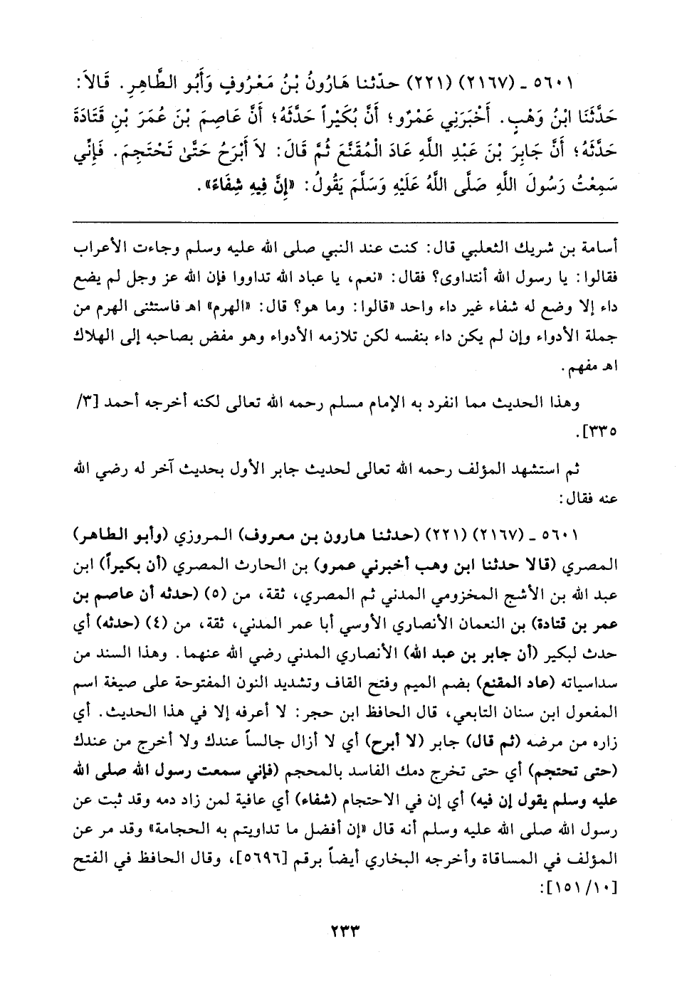 ٥٦٠١ - (٢١٦٧) (٢٢١) حدَّثنا هَارُونُ بن مَعْرُوفٍ وَأَبُو الطَّاهِرِ. قَالا: حَدَّثَنَا ابْنُ وَهْبٍ. أَخْبَرَنِي عَمْرٌو؛ أَنَّ بُكَيرًا حدَّثَهُ؛ أَنَّ عَاصِمَ بنَ عُمَرَ بنِ قَتَادَةَ حدَّثَهُ؛ أَنَّ جَابِرَ بْنَ عَبْدِ اللهِ عَادَ الْمُقَنَّعَ ثُمَّ قَال: لَا أَبْرَحُ حَتَّى تَحْتَجِمَ. فَإِنِّي سَمِعْتُ رَسُولَ اللهِ صَلَّى اللهُ عَلَيهِ وَسَلَّمَ يَقُولُ: "إِنَّ فِيهِ شِفَاءً"