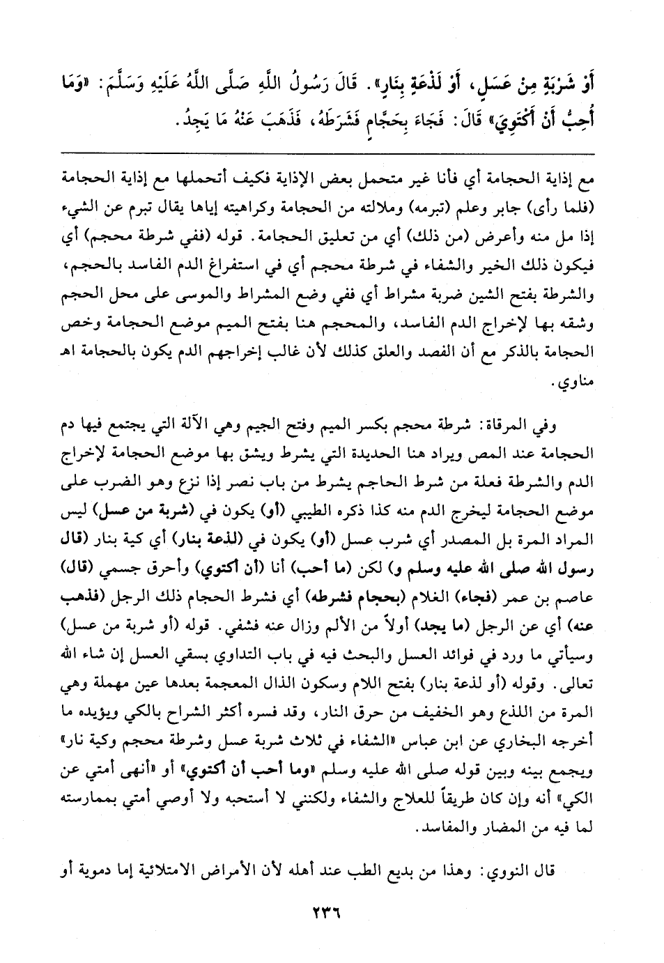 أَوْ شَرْبَةٍ مِنْ عَسَلٍ، أَوْ لَذْعَةٍ بِنَارٍ". قَال رَسُولُ اللهِ صَلَّى اللهُ عَلَيهِ وَسَلَّمَ: "وَمَا أُحِبُّ أَنْ أَكْتَويَ" قَال: فَجَاءَ بِحَجَّامِ فَشَرَطَهُ، فَذَهَبَ عَنْهُ مَا يَجِدُ