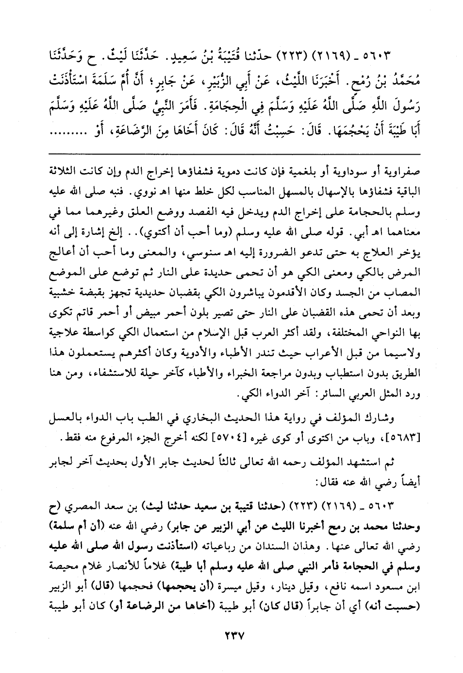 ٥٦٠٣ - (٢١٦٩) (٢٢٣) (حَدَّثَنَا قتيبة بن سعيد حَدَّثَنَا ليث) بن سعد المصري (ح وحدثنا محمد بن رمح أخبرنا الليث عن أبي الزبير عن جابر) رضي الله عنه (أن أم سلمة) رضي الله تعالى عنها. وهذان السندان من رباعياته (استأذنت رسول الله صلى الله عليه وسلم في الحجامة فأمر النبي صلى الله عليه وسلم أبا طيبة) غلامًا للأنصار غلام محيصة بن مسعود اسمه نافع، وقيل دينار، وقيل ميسرة (أن يحجمها) فحجمها (قال) أبو الزبير (حسبت أنَّه) أي أن جابرًا (قال كان) أبو طيبة (أخاها من الرضاعة أو) كان أبو طيبة