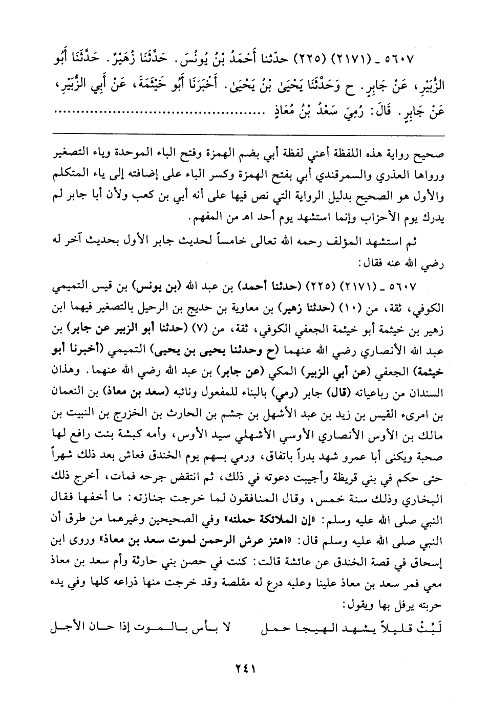 ٥٦٠٧ - (٢١٧١) (٢٢٥) حدَّثنا أَحْمَدُ بْنُ يُونُسَ. حَدَّثَنَا زُهَيرٌ. حَدَّثَنَا أَبُو الزُّبَيرِ، عَنْ جَابِرٍ. ح وَحدَّثَنَا يَحْيَى بْنُ يَحْيَى. أَخبَرَنَا أَبُو خَيثَمَةَ، عَنْ أَبِي الزُّبَيرِ، عَنْ جَابِرٍ. قَال: رُمِيَ سَعْدُ بْنُ مُعَاذٍ