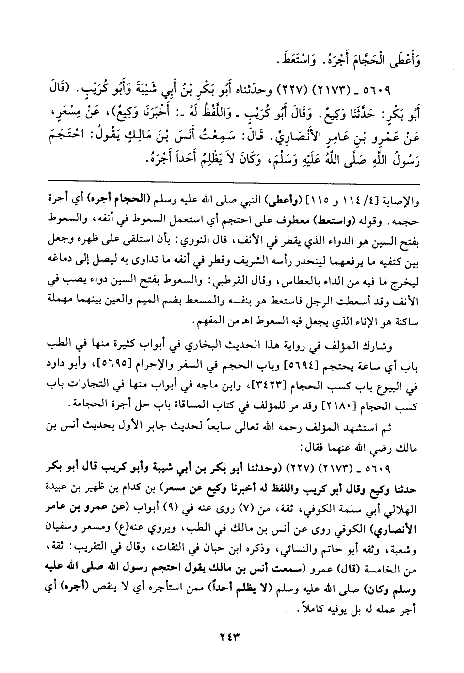 ٥٦٠٩ - (٢١٧٣) (٢٢٧) وحدَّثناه أَبُو بَكْرٍ بْنُ أَبِي شَيبَةَ وَأَبُو كُرَيبٍ. (قَال أَبُو بَكْرٍ: حَدَّثَنَا وَكِيعٌ. وَقَال أَبُو كُرَيبٍ - وَاللَّفْظُ لَهُ -: أَخْبَرَنَا وَكِيعٌ)، عَنْ مِسْعَرٍ، عَنْ عَمْرِو بْنِ عَامِرٍ الأَنْصَارِيُّ. قَال: سَمِعْتُ أَنَسَ بْنَ مَالِكٍ يَقُولُ: احْتَجَمَ رَسُولُ اللهِ صَلَّى اللهُ عَلَيهِ وَسَلَّمَ، وَكَانَ لَا يَظْلِمُ أَحَدًا أَجْرَهُ