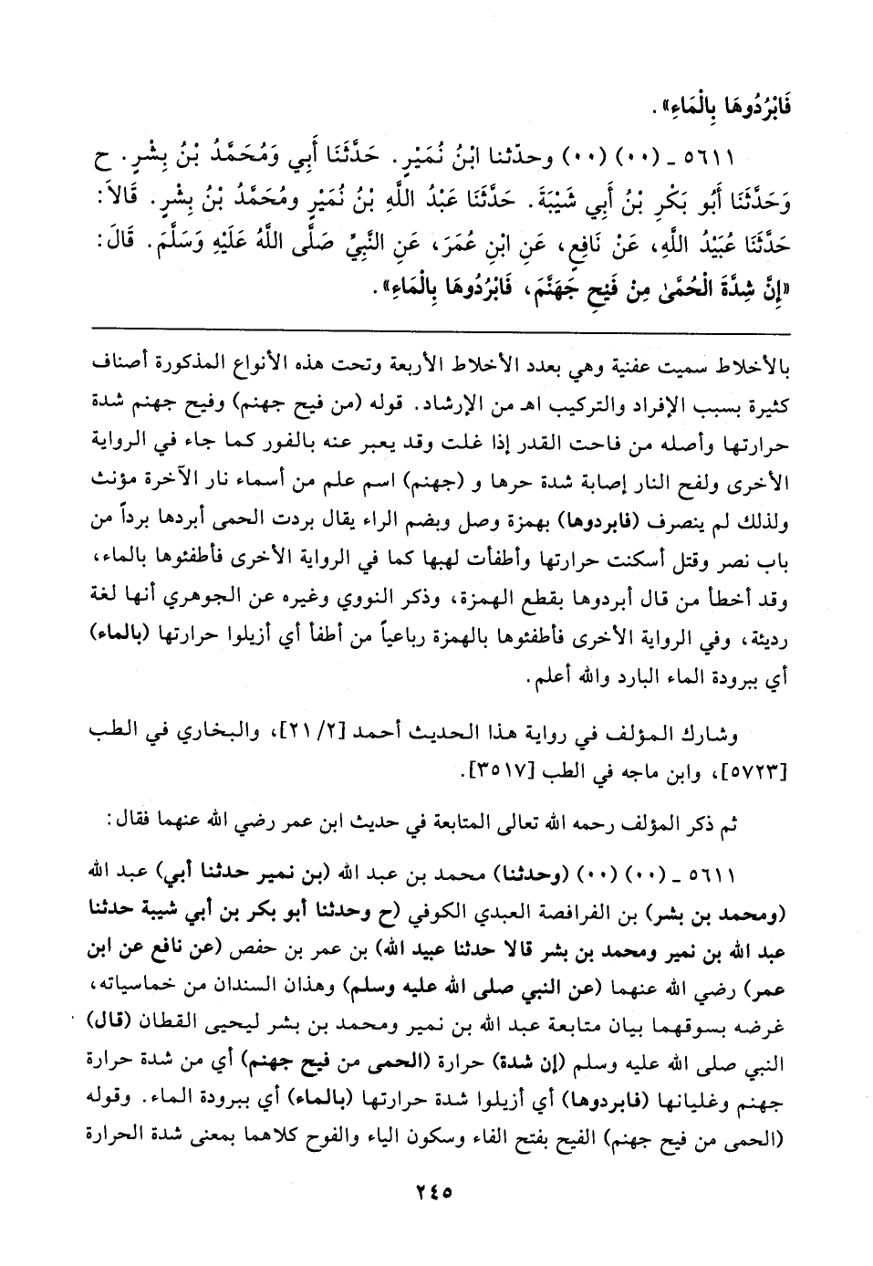 ٥٦١١ - (٠٠) (٠٠) (وحدثنا) محمد بن عبد الله (بن نمير حَدَّثَنَا أبي) عبد الله (ومحمد بن بشر) بن الفرافصة العبدي الكوفي (ح وحدثنا أبو بكر بن أبي شيبة حَدَّثَنَا عبد الله بن نمير ومحمد بن بشر قالا حَدَّثَنَا عبيد الله) بن عمر بن حفص (عن نافع عن ابن عمر) رضي الله عنهما (عن النبي صلى الله عليه وسلم) وهذان السندان من خماسياته، غرضه بسوقهما بيان متابعة عبد الله بن نمير ومحمد بن بشر ليحيى القطان (قال) النبي صلى الله عليه وسلم (أن شدة) حرارة (الحمى من فيح جهنم) أي من شدة حرارة جهنم وغليانها (فابردوها) أي أزيلوا شدة حرارتها (بالماء) أي ببرودة الماء. وقوله (الحمى من فيح جهنم) الفيح بفتح الفاء وسكون الياء والفوح كلاهما بمعنى شدة الحرارة